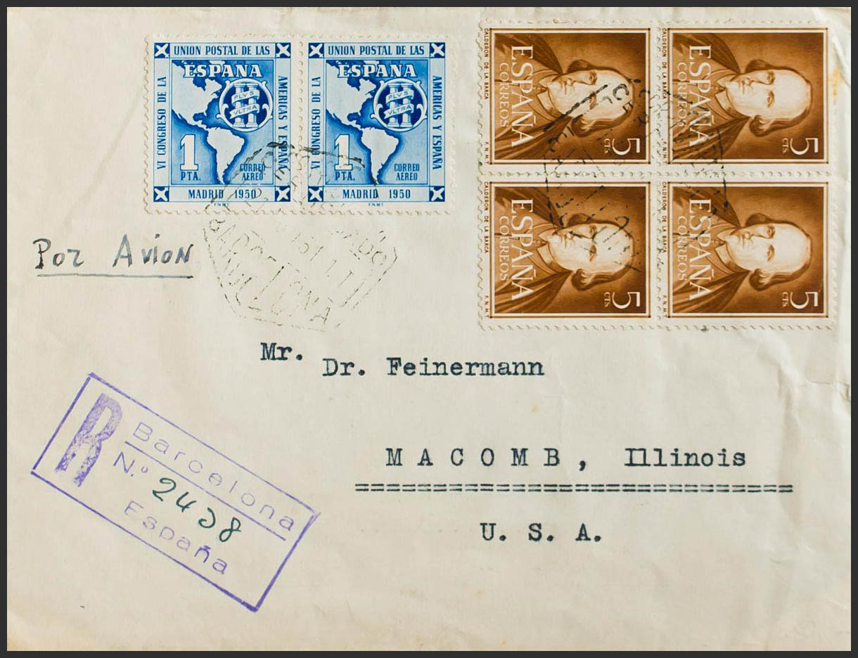 1071(4), 1091(2). 1951. 5 chestnut cts, block of four and 1 blue pts, two stamps. Certificate from BARCELONA to MACOMB (USA). On the back arrival. MAGNIFICENT.
