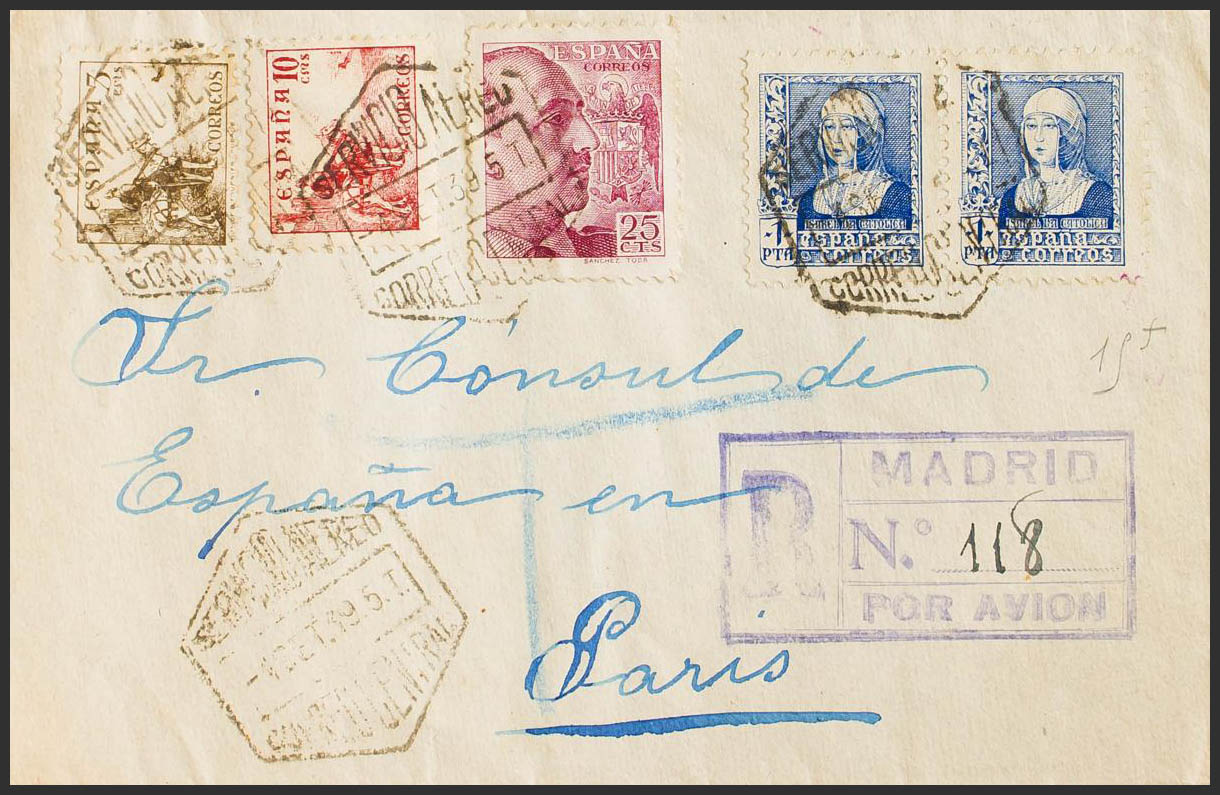 860(2), 868, 816, 818. 1939. 1 blue pts, two stamps and various values. Certificate from MADRID to PARIS (FRANCE). MAGNIFICENT.