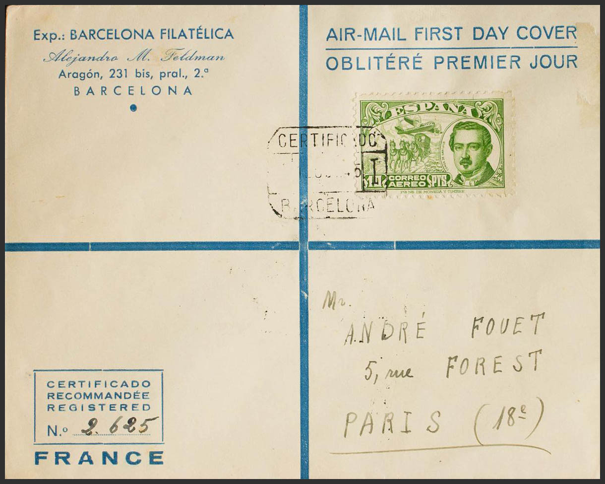 990. 1945. 10 pts green. Certificate from MADRID to PARIS. MAGNIFICENT.