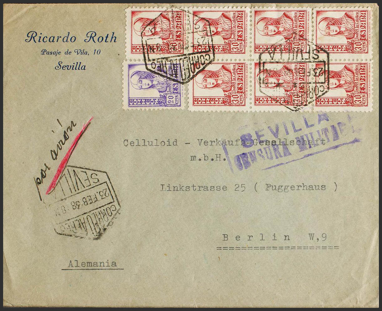 821, 823(7). 1938. 20 cts purple and 30 cts pink, seven stamps. Air Mail from SEVILLE to BERLIN (GERMANY). MAGNIFICENT.