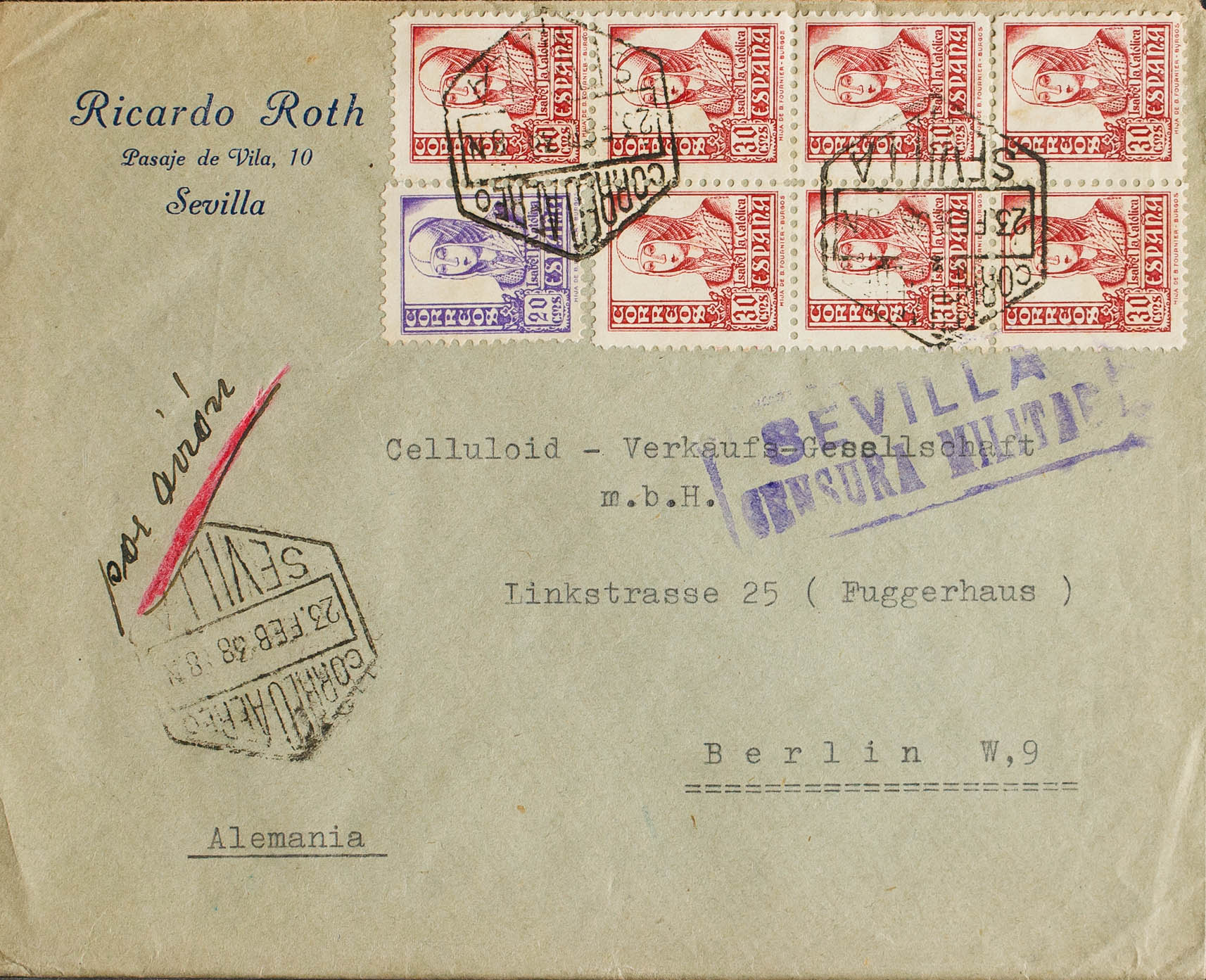 English 821, 823(7). 1938. 20 cts purple and 30 cts pink, seven stamps. Air Mail from SEVILLE to BERLIN (GERMANY). MAGNIFICENT.