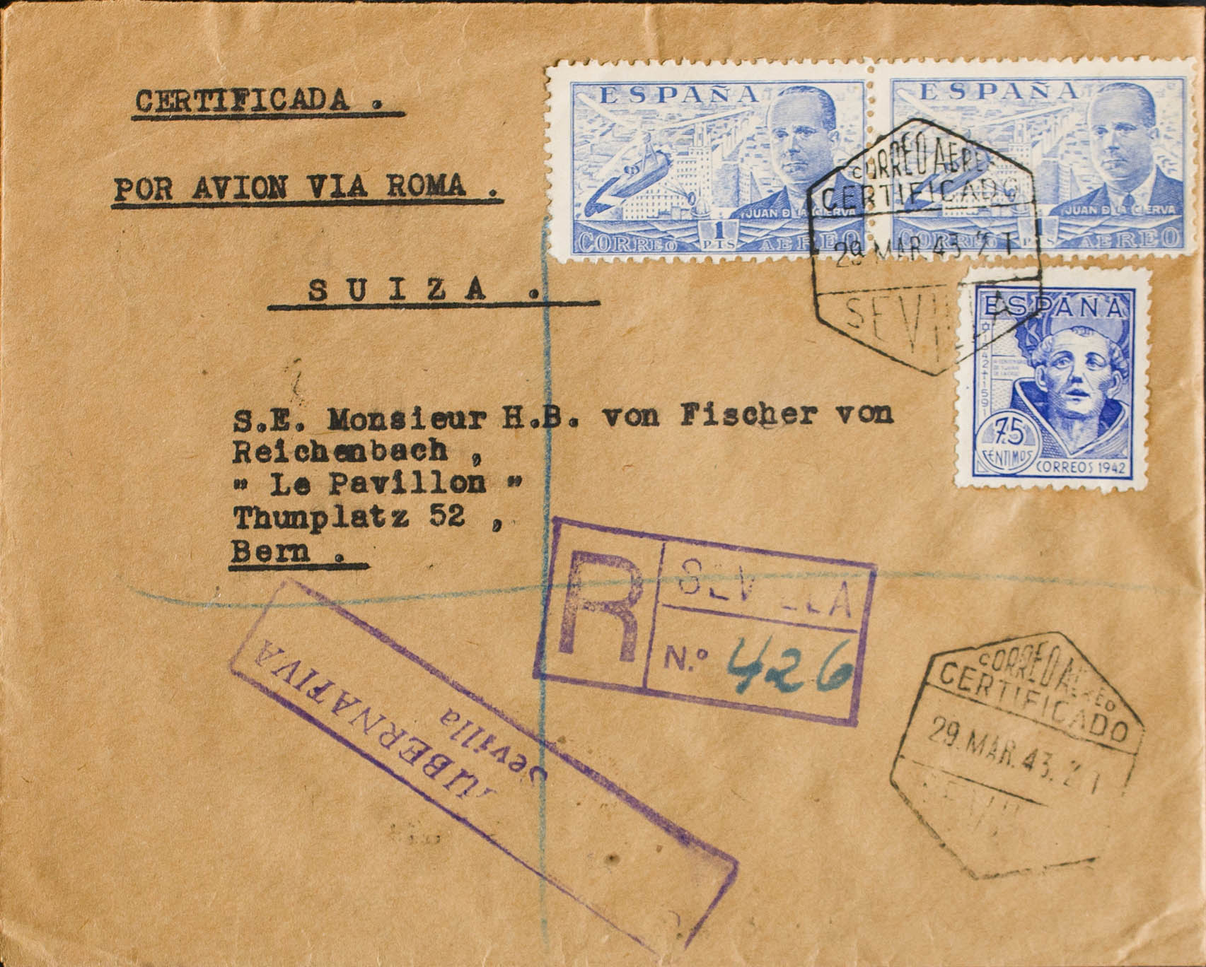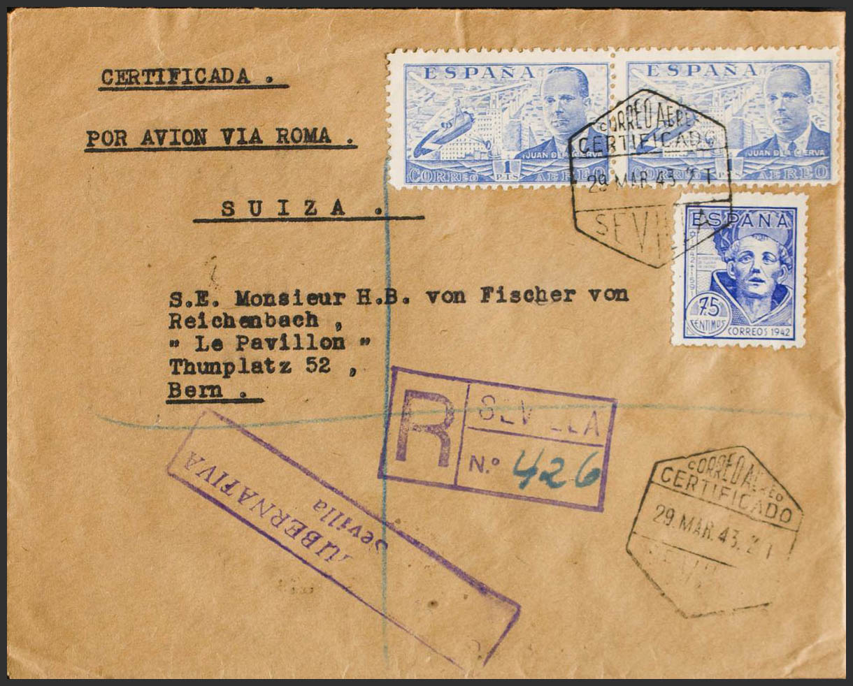 944(2), 956. 1943. 1 blue pts, two stamps and 75 overseas cts. Certificate from SEVILLE to BERN (SWITZERLAND). On the back arrival. MAGNIFICENT.
