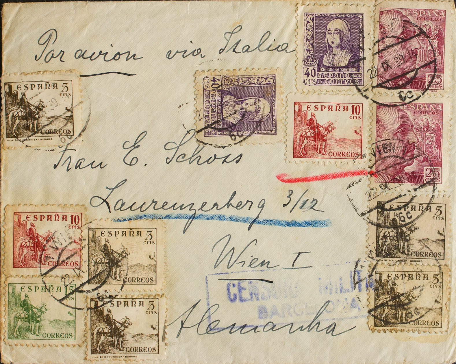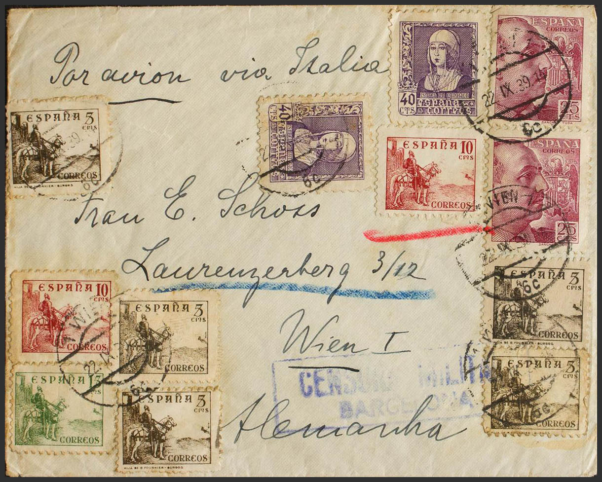 858(2), 868(2). 1939. Violet 40 cts, two stamps, lilac carmine 25 cts, two stamps and various values. Airmail from BARCELONA to VIENNA. Postmark 1-WIEN-1, applied on arrival. MAGNIFICENT.