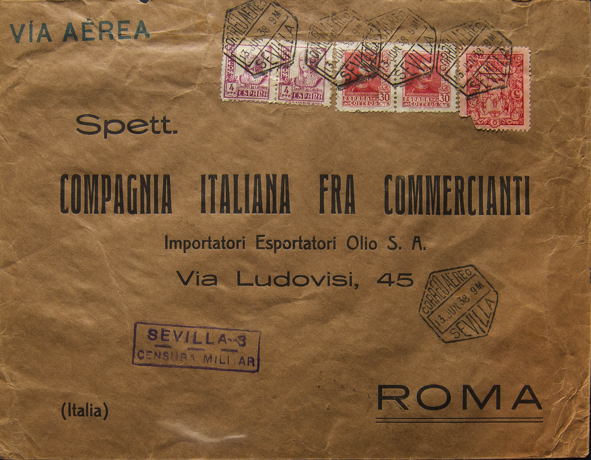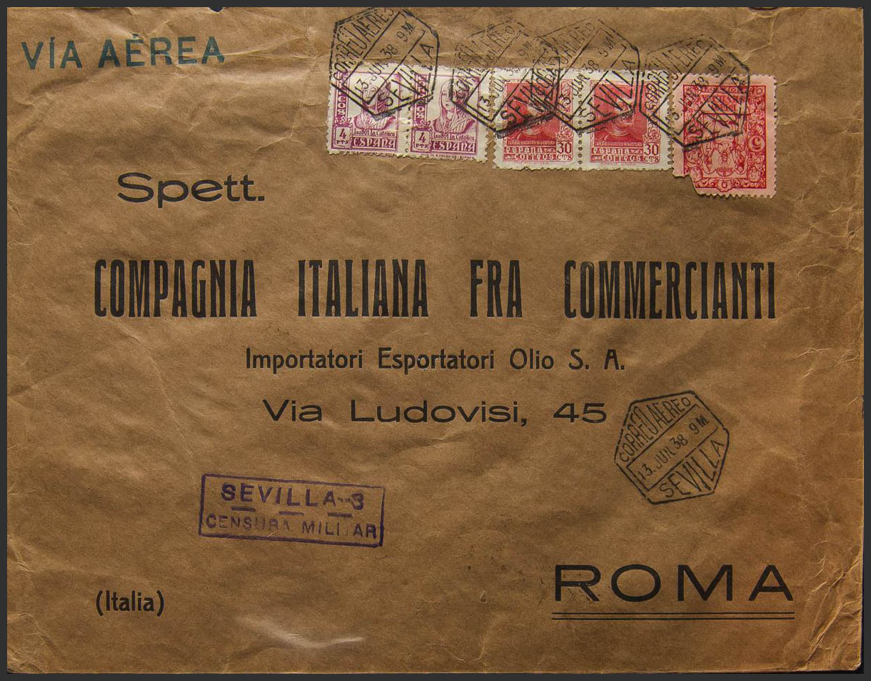829(2). 1938. 4 carmine pts, two stamps, vignette 5 cts from Sevilla (small break). Airmail from SEVILLE to ROME (ITALY). On the back arrival. MAGNIFICENT.