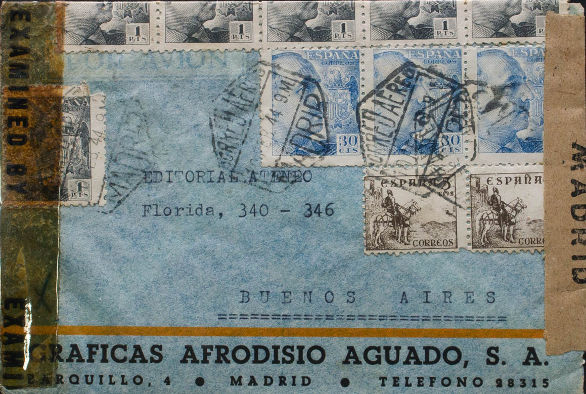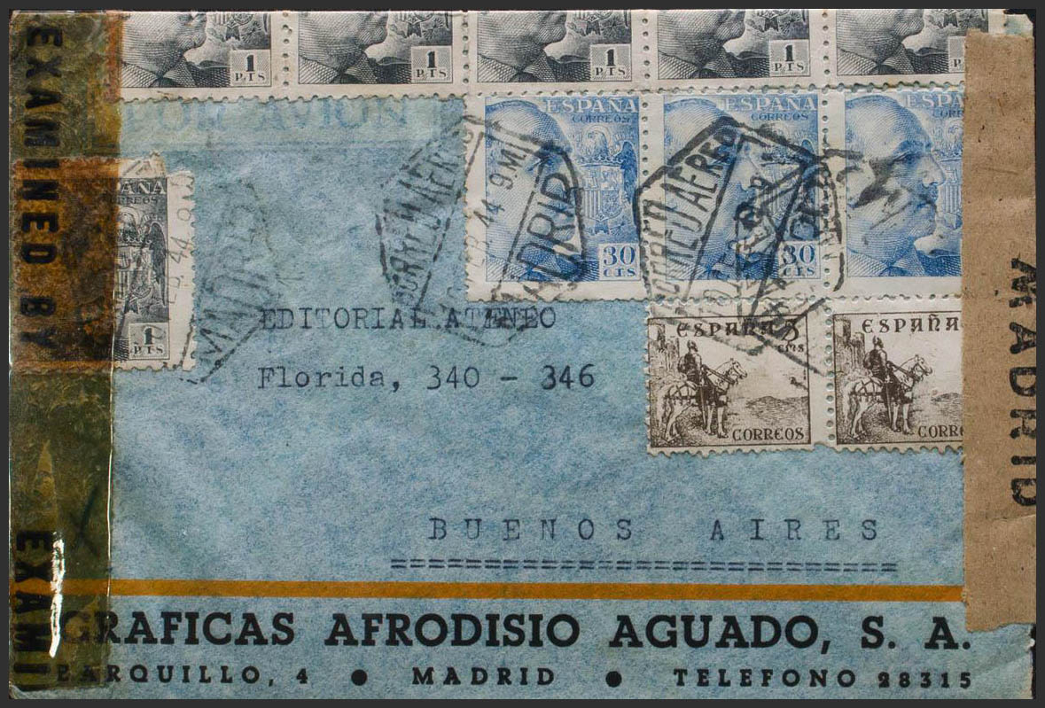 924(3), 931(6). 1940. 30 blue cts, three stamps and 1 black pts, six stamps (folded towards the back). MADRID to BUENOS AIRES (ARGENTINA). On the back arrival. MAGNIFICENT.