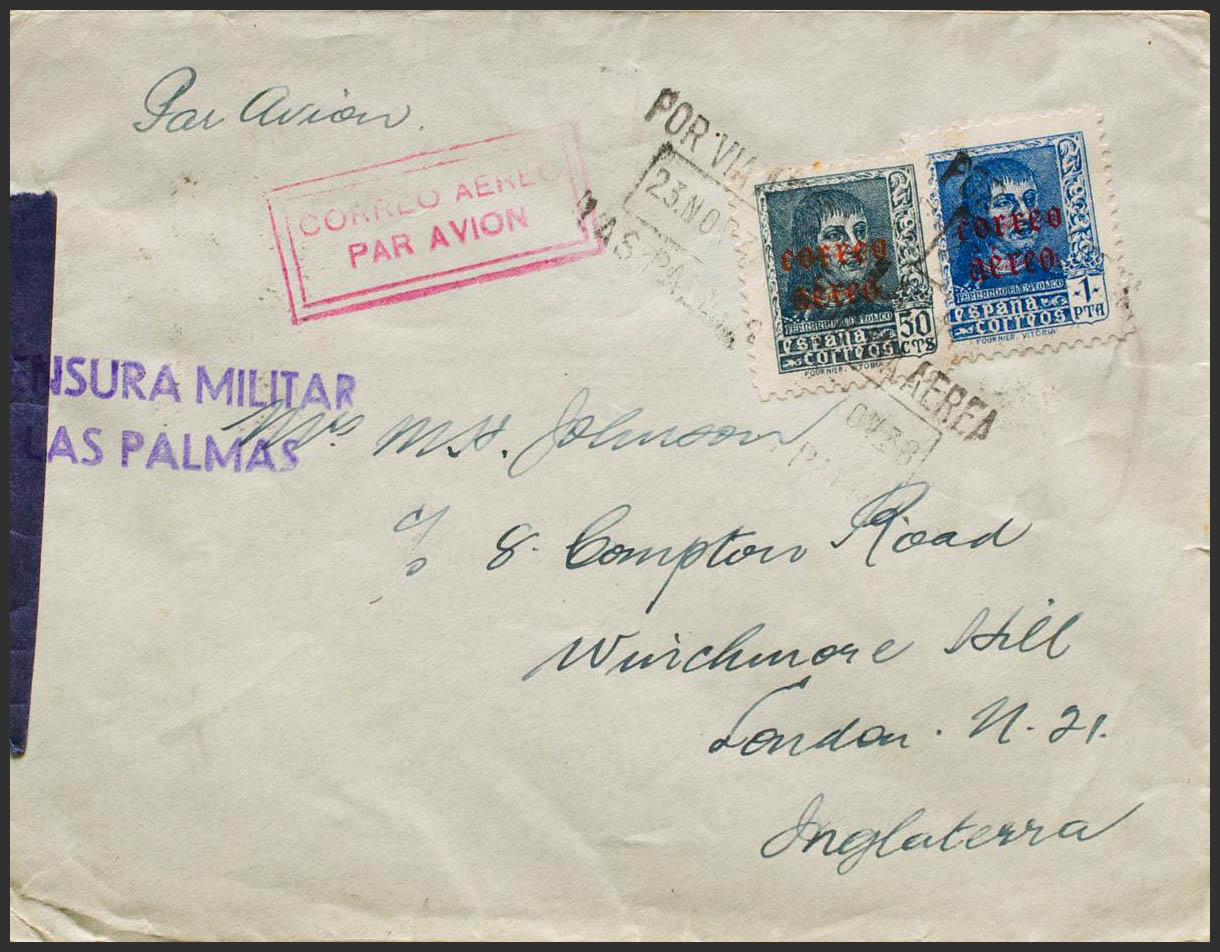 845/46. 1938. Complete series. LAS PALMAS to LONDON (GREAT BRITAIN). On the back transit. MAGNIFICENT.