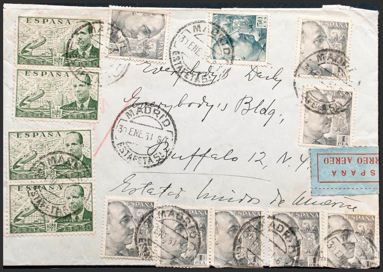 1053, 1056(8), 945(4). 1954. 50 cts gray blue, 1 pts black, eight stamps (some folded) and 2 pts green, four stamps. MADRID to BUFALO (UNITED STATES). MAGNIFICENT.