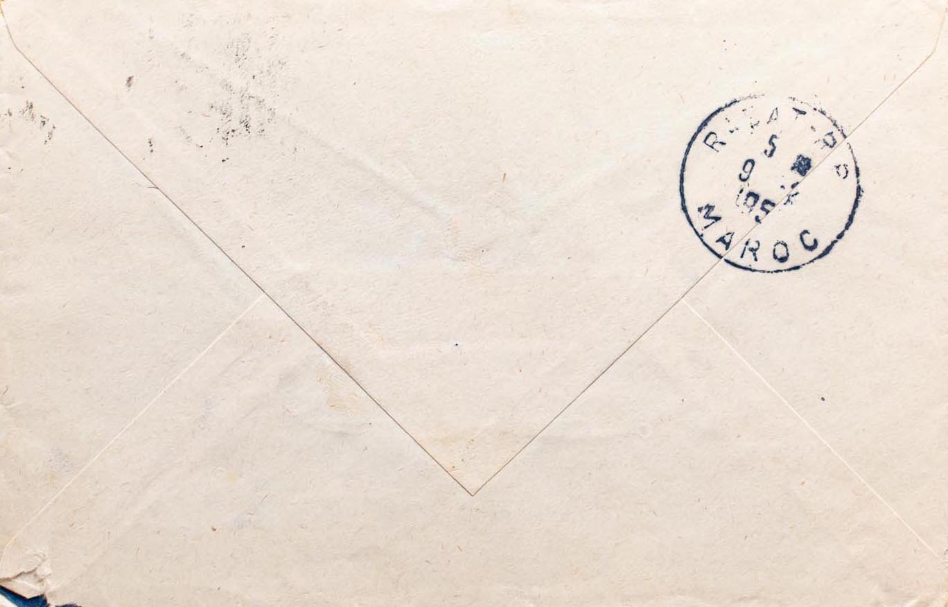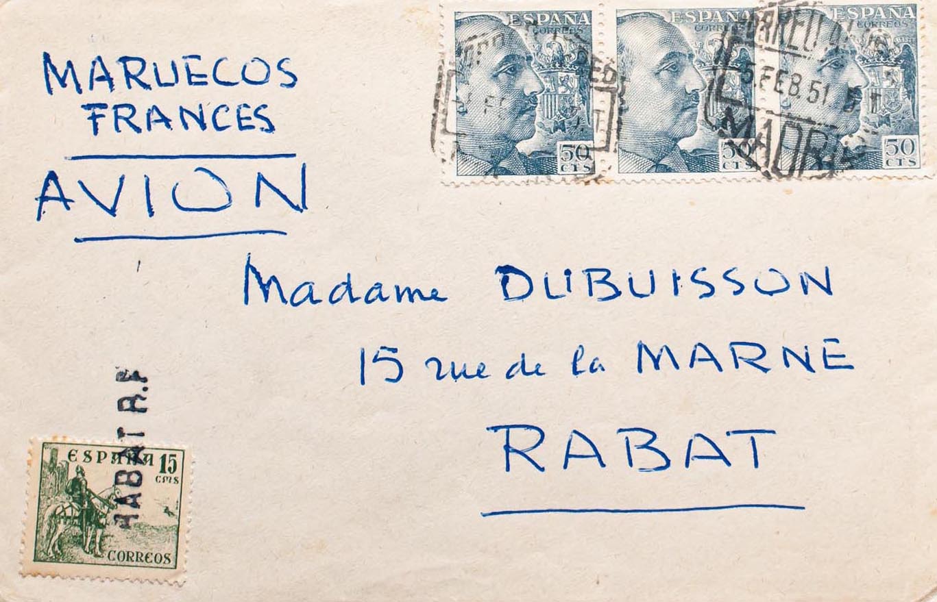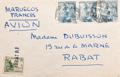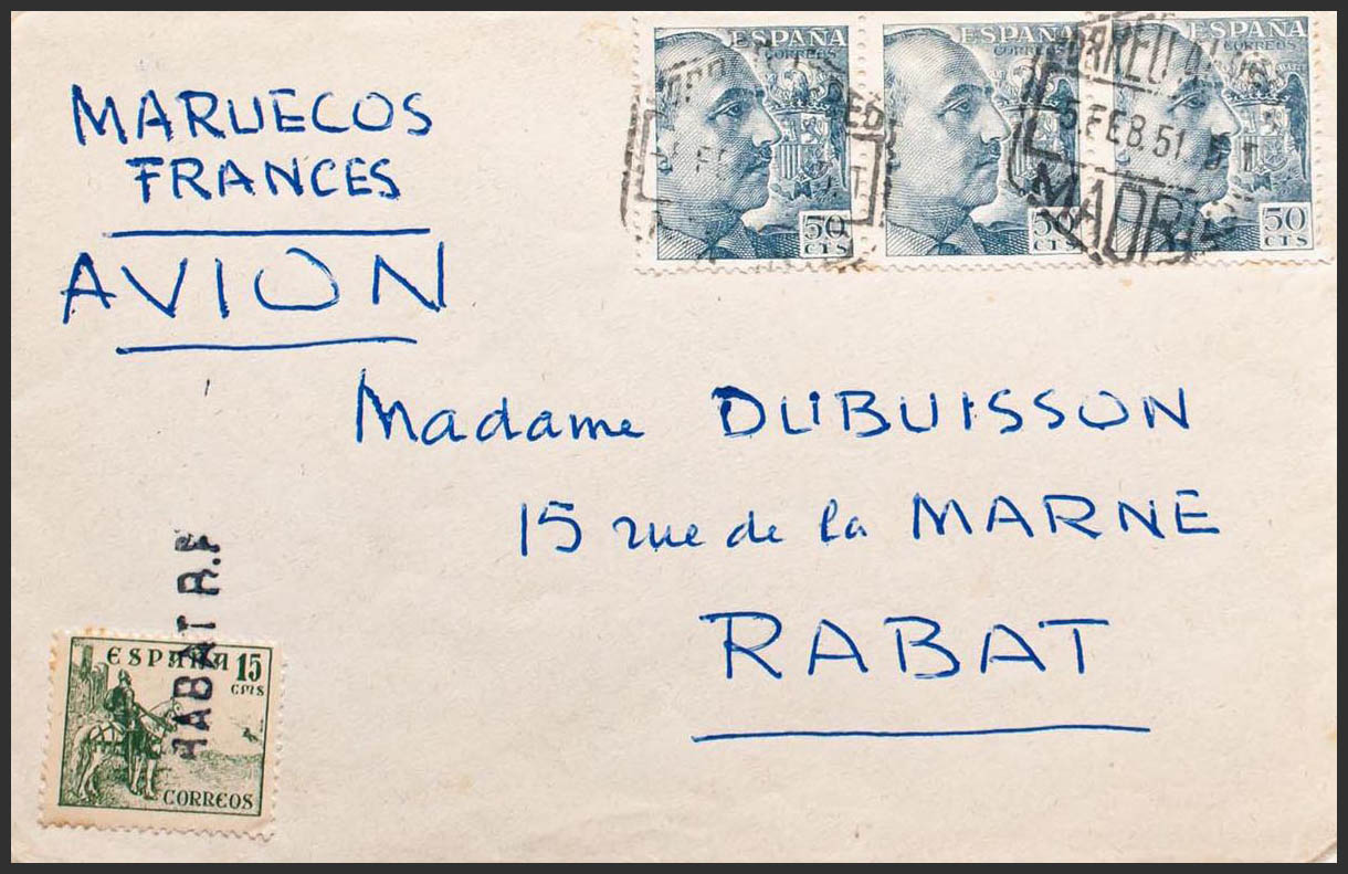 1053(3), 1046. 1951. 50 cts gray, three stamps and 15 cts green. MADRID to RABAT (MOROCCO). RABAT RF postmark on the 15 cts and arrival on the back. MAGNIFICENT.