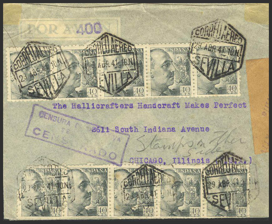 English 917(7),925(10). 1941. 40 slate cts, two strips of five and 10 red cts, pair and strip of six, on the back. SEVILLE to ILLIONIS (USA). Postmark AIR CORREO / SEVILLA, on the front mark CENSURA GOVERNMENT / SEVILLA / CENSURED. MAGNIFICENT.