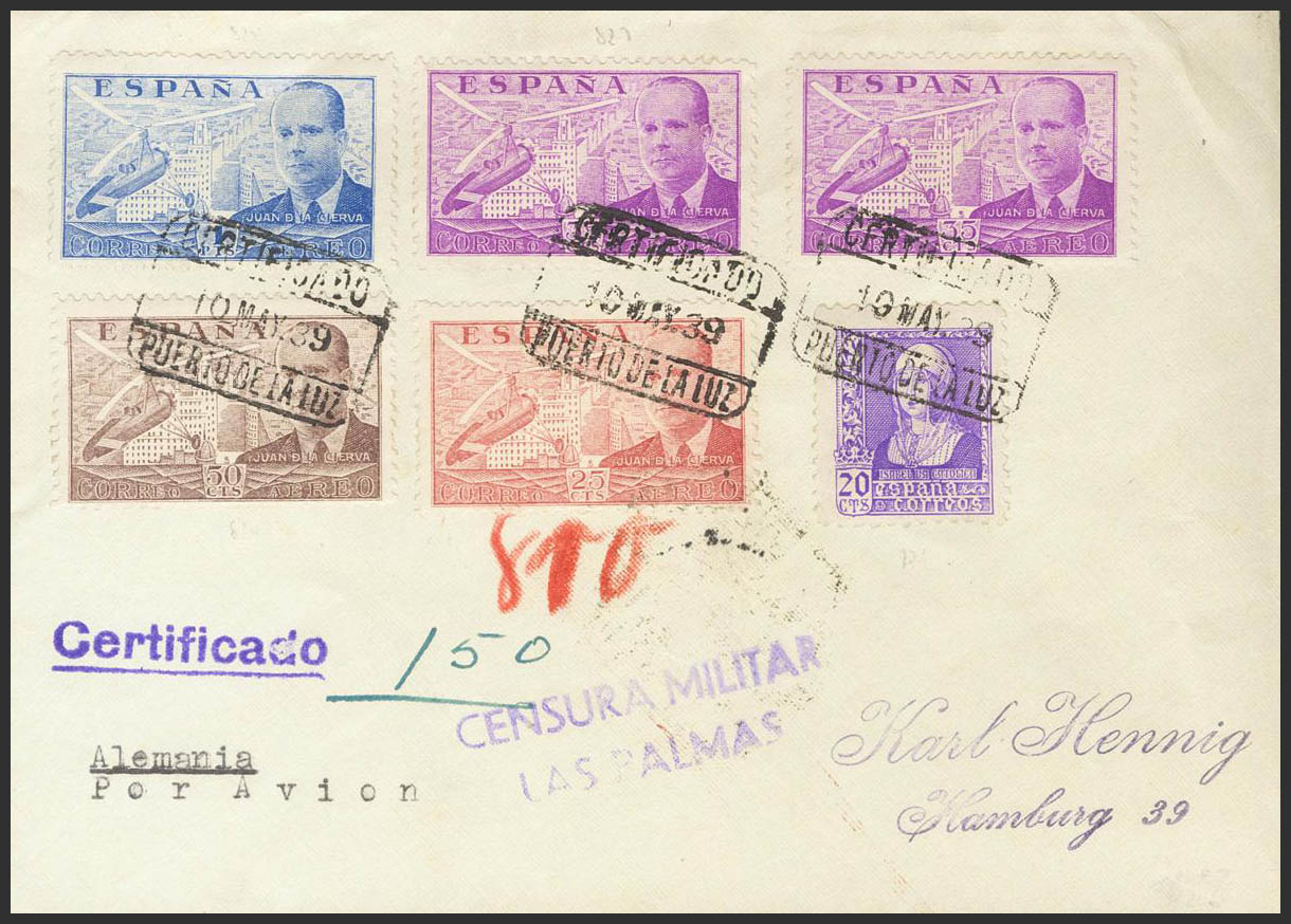 881, 882(2), 883, 884. 1939. Various values. Certified Air Letter from PUERTO DE LA LUZ (CANARY ISLANDS) to HAMBURG (GERMANY). On the back arrival. MAGNIFICENT.