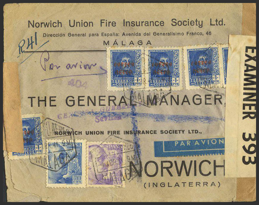 846(5), 874, 922. 1941. 20 cts., 70 cts. and 1 pts., five stamps. MALAGA to NORWICH (ENGLAND). Postmark AIR MAIL / MALAGA, arrival on the back. MAGNIFICENT.