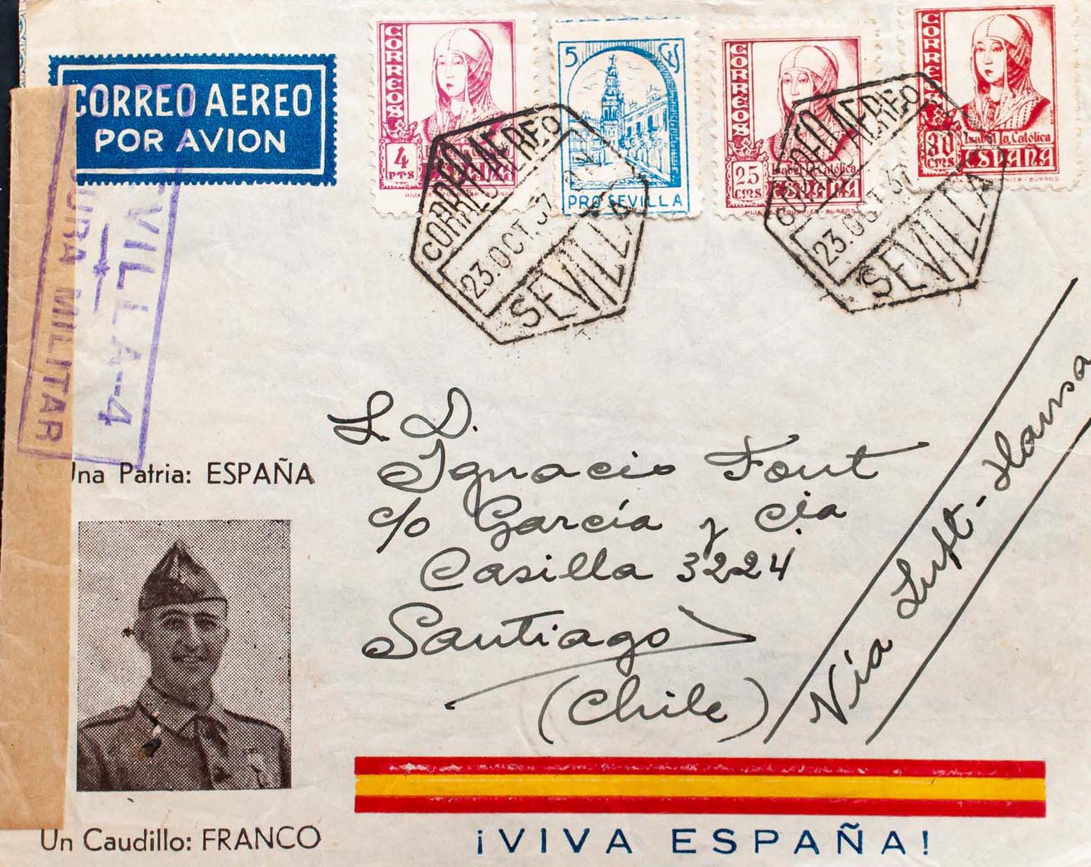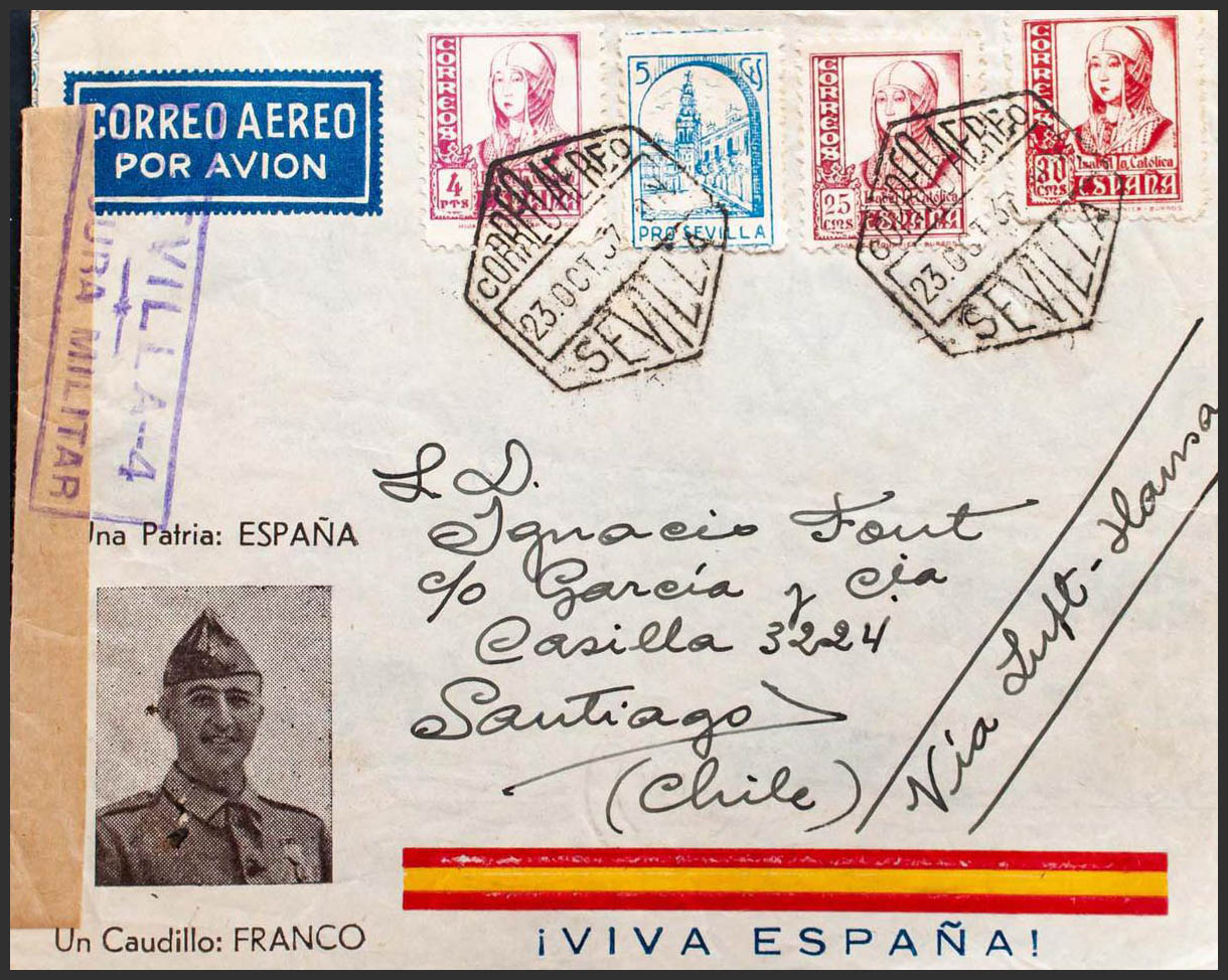 822, 823, 829. 1937. 25 cts red, 30 cts pink, 4 pts lilac pink and 5 cts Beneficio. Front Air Mail from SEVILLE to SANTIAGO DE CHILE. MAGNIFICENT.