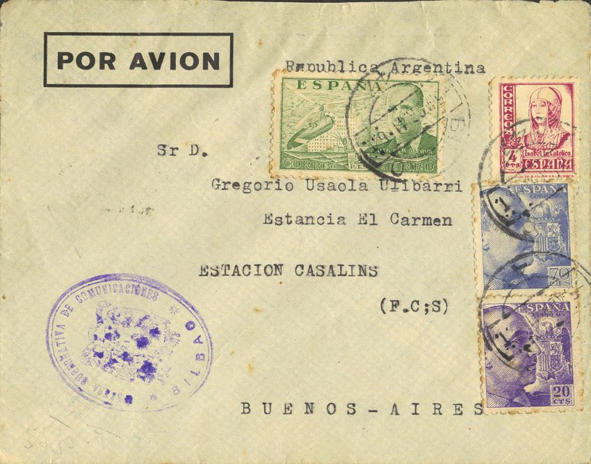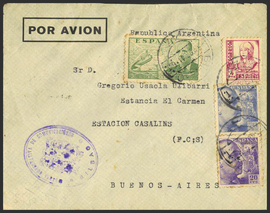 829. 1941. 4 carmine pts. BILBAO to ARGENTINA. On the back arrival. MAGNIFICENT.