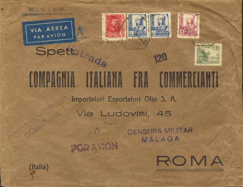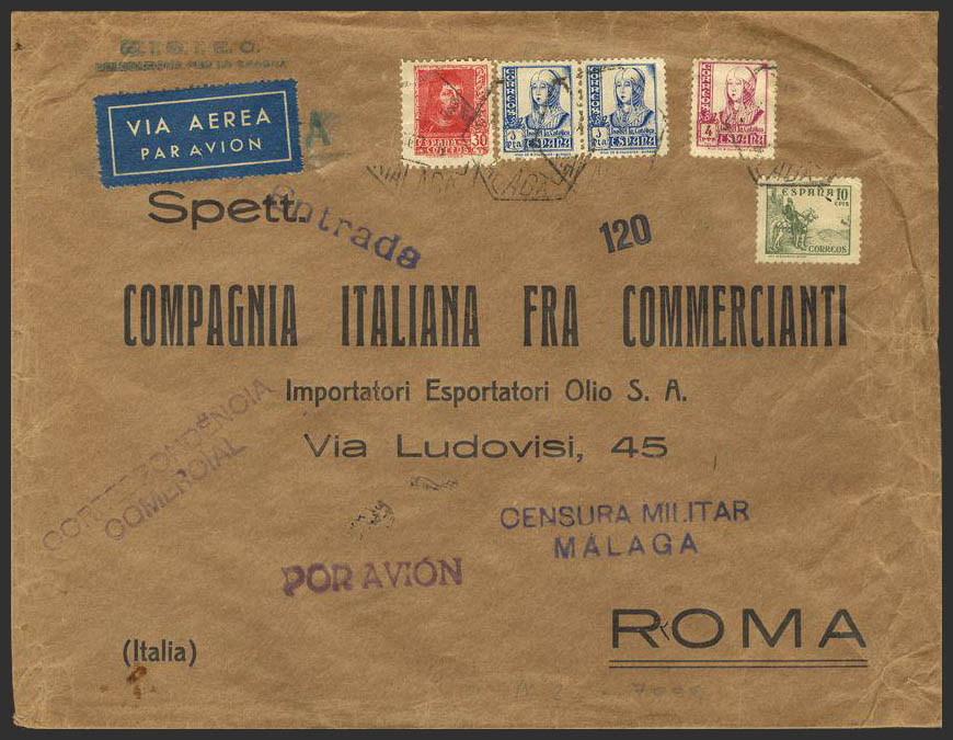 817, 828(2), 829, 844. 1938. 10 sts, 30 sts, 1 sts, pair and 4 sts. Air charter from MALAGA to ROME. A detached stamp, on the back arrival. MAGNIFICENT.