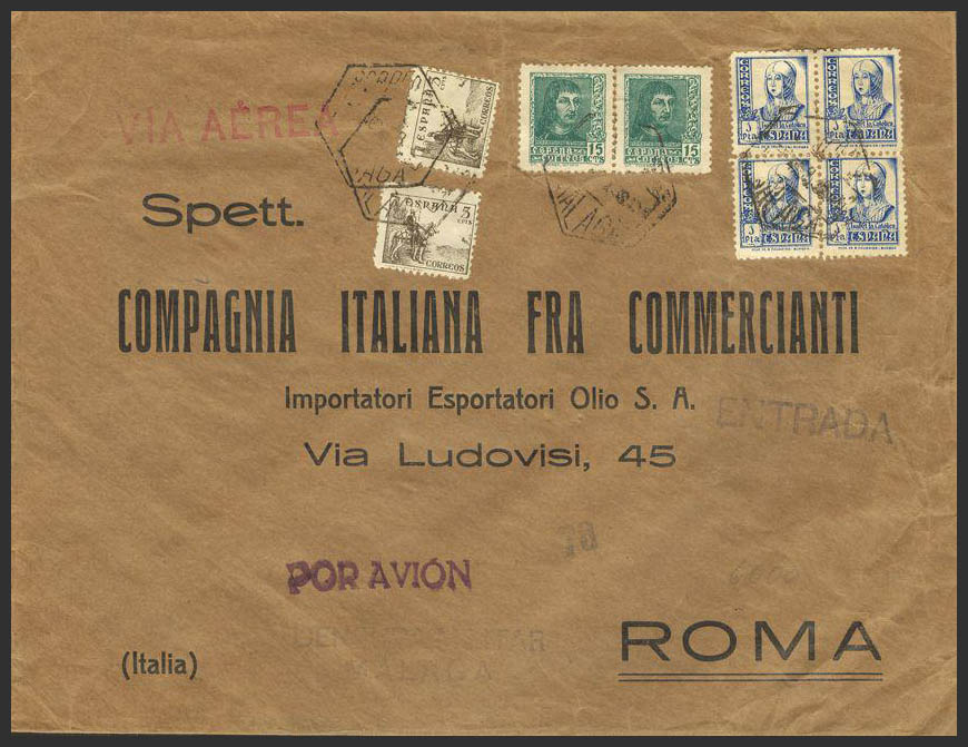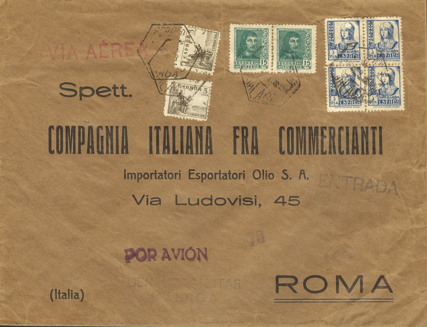 816(2), 829(4), 841(2). 1938. 5 cts, two stamps, 15 cts, pair and 1 pts, block of four. Air charter from MALAGA to ROME. On the back arrival. MAGNIFICENT.