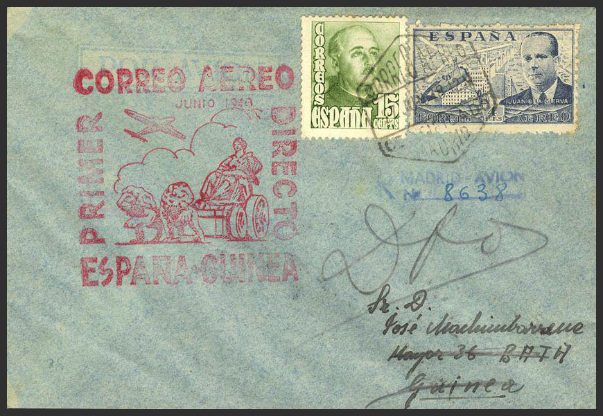 946, 1021. 1948. 4 pts and 15 cts. FIRST DIRECT AIRMAIL FROM SPAIN TO GUINEA. On the back various transits, in the end the letter is returned to its origin. MAGNIFICENT.