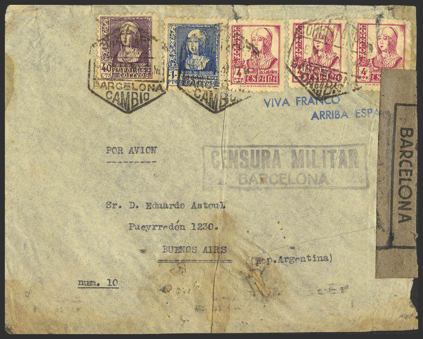 829(4), 858, 860. 1939. 40 cts, 1 pts and 4 pts, three stamps. Air Charter from BARCELONA to BUENOS AIRES. On the back arrival. MAGNIFICENT RARE POSTAGE.