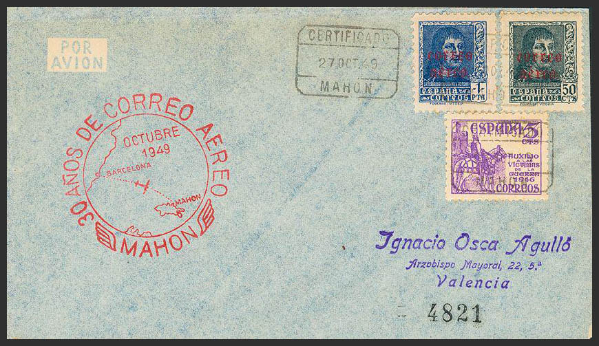 English 845/46, 1062. 1949. 5 cts, 50 cts and 1 pts. Certificate from MAHON to VALENCIA. Mark 30 YEARS OF AIR MAIL / MAHON, arrival back. MAGNIFICENT.