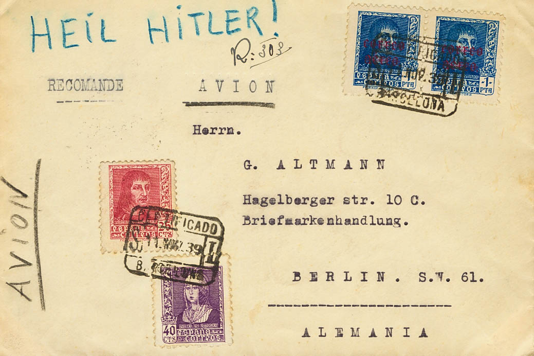843, 846(2), 858. 1939. 25 cts carmine, 1 pts blue, pair and 40 cts violet. Certificate from BARCELONA to BERLIN. On the back arrival. MAGNIFICENT.