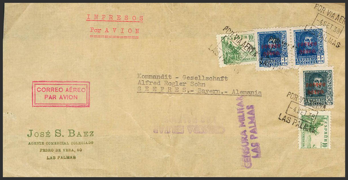 817(2), 845, 846(2). 1938. 10 green cts, two stamps, 50 slate cts and 1 blue pts, two stamps. Newspaper strip from SANTA CRUZ DE TENERIFE to GEFREES (GERMANY). MAGNIFICENT.