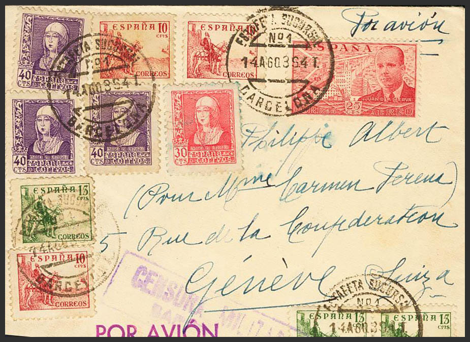 English 857, 858(3). 1939. 30 pink cts, 40 violet cts, three stamps and various values. BARCELONA to GENEVA (SWITZERLAND). MAGNIFICENT.
