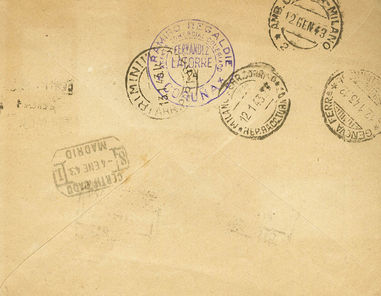|ENVELOPE| 954/56, 954, 916. 1943. Complete set, 20 cts violet and 5 cts sepia. Certificate from LA CORUÑA to RIMINI (ITALY). On the back, transits Madrid, Genoa, Milan and arrival. MAGNIFICENT.