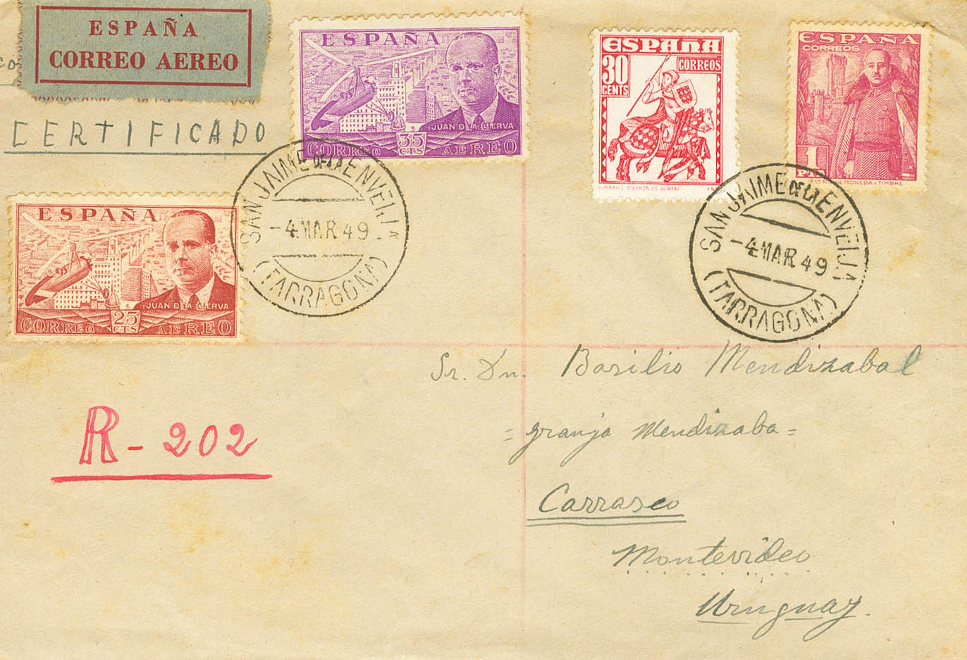 |ENVELOPE| 1032, 941/42, 1034. 1949. 1 pts pink, 25 cts red, 35 cts lilac pink and 30 cts red. Certificate from SAN JAIME DE LA ENVEIJA (TARRAGONA) to MONTEVIDEO (URUGUAY). On the back, stickers from Aid to Children (English) and 10 cts Charity. NICE AND RARE.