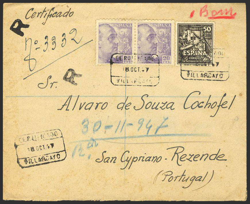 922(2), 1012. 1947. 20 cts, couple and 50 cts. Certificate from VILLARCAYO to PORTUGAL. On the back arrival. MAGNIFICENT.