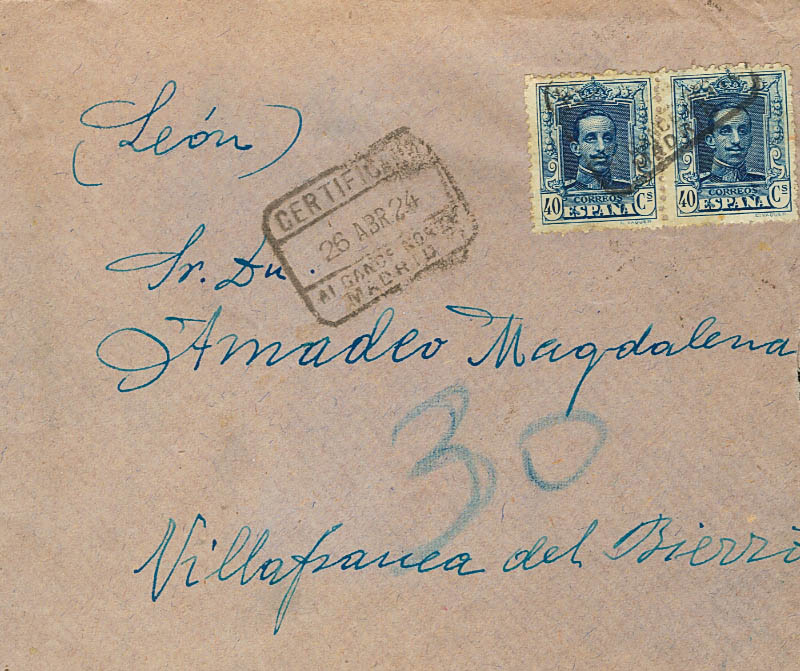 319(2). 1924. 40 blue cts, pair. Certificate from MADRID to VILLAFRANCA DEL BIERZO. MAGNIFICENT.