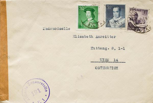|ENVELOPE| 1076(4), 1080(2). 1958. 75 cts ultramarine, four stamps and 2´50 pts yellow chestnut, two stamps. Certified from MADRID to BONN (GERMANY). Postage of 8 pts according to the rate of September 1953 by certified mail. MAGNIFICENT.