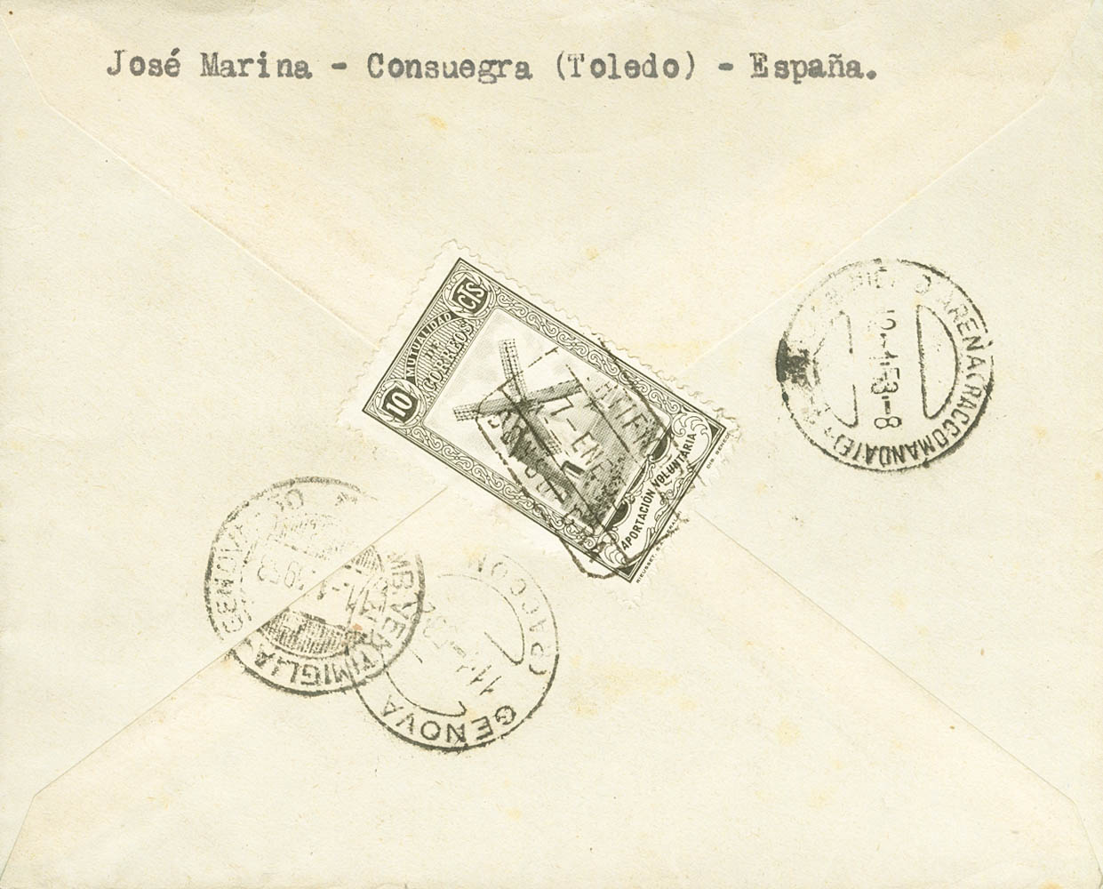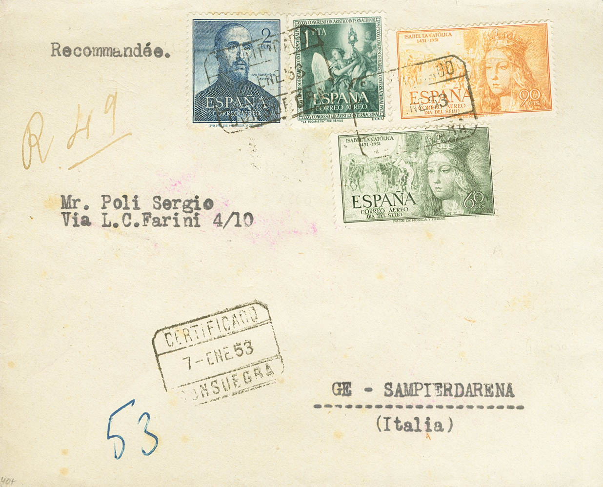 English |ENVELOPE| 1118, 1097, 1098, 1117. 1953. 2 pts blue, 60 cts green, 90 cts orange and 1 pts dark green. Certificate from CONSUEGRA (TOLEDO) to SAMPIERDARENA (ITALY). Transits and arrival on the back. MAGNIFICENT AND UNUSUAL ORIGIN-DESTINATION.