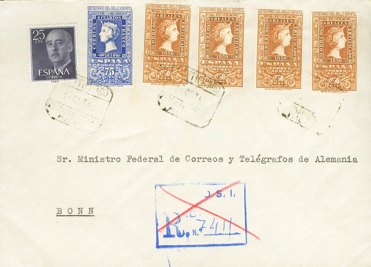 |ENVELOPE| 1076, 1080(4), 1146. 1960. 75 cts ultramarine, 2´50 pts brown and yellow, four stamps and 25 cts black violet. Certified from MADRID to BONN (GERMANY). Postage of 11 pts according to the May 1959 rate by certified mail. MAGNIFICENT.
