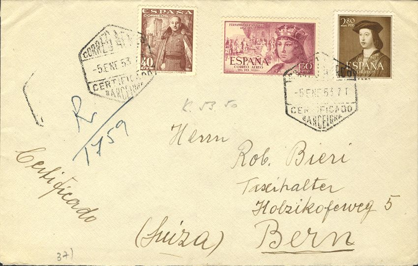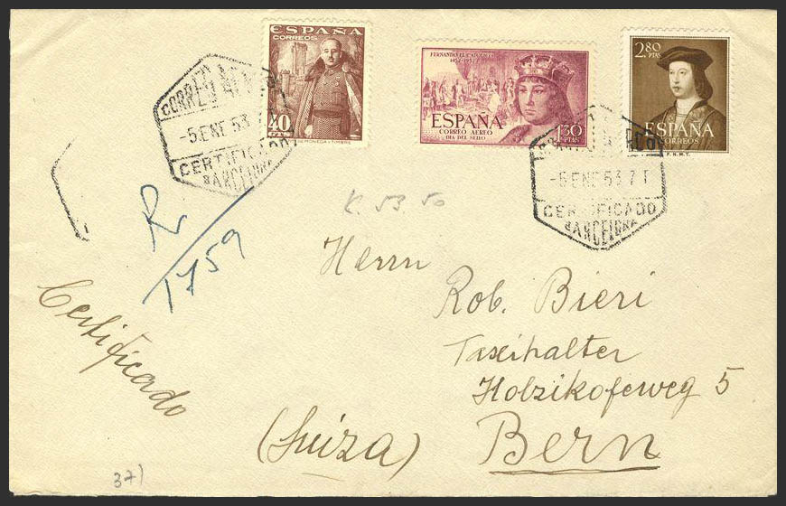 1110. 1953. Various values. Certificate from MADRID to SWITZERLAND. On the back arrival. MAGNIFICENT AND RARE.