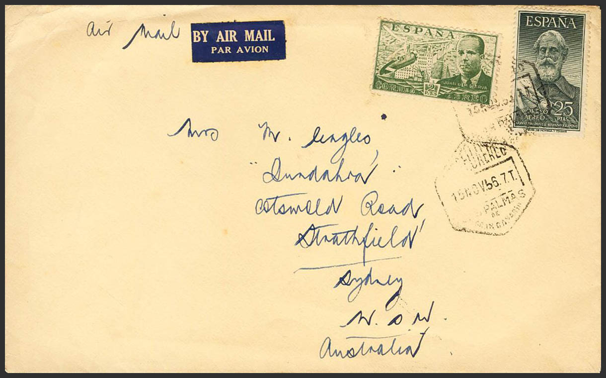 1124, 945. 1956. 25 gray green sts and 2 green sts. LAS PALMAS to SYDNEY. MAGNIFICENT.