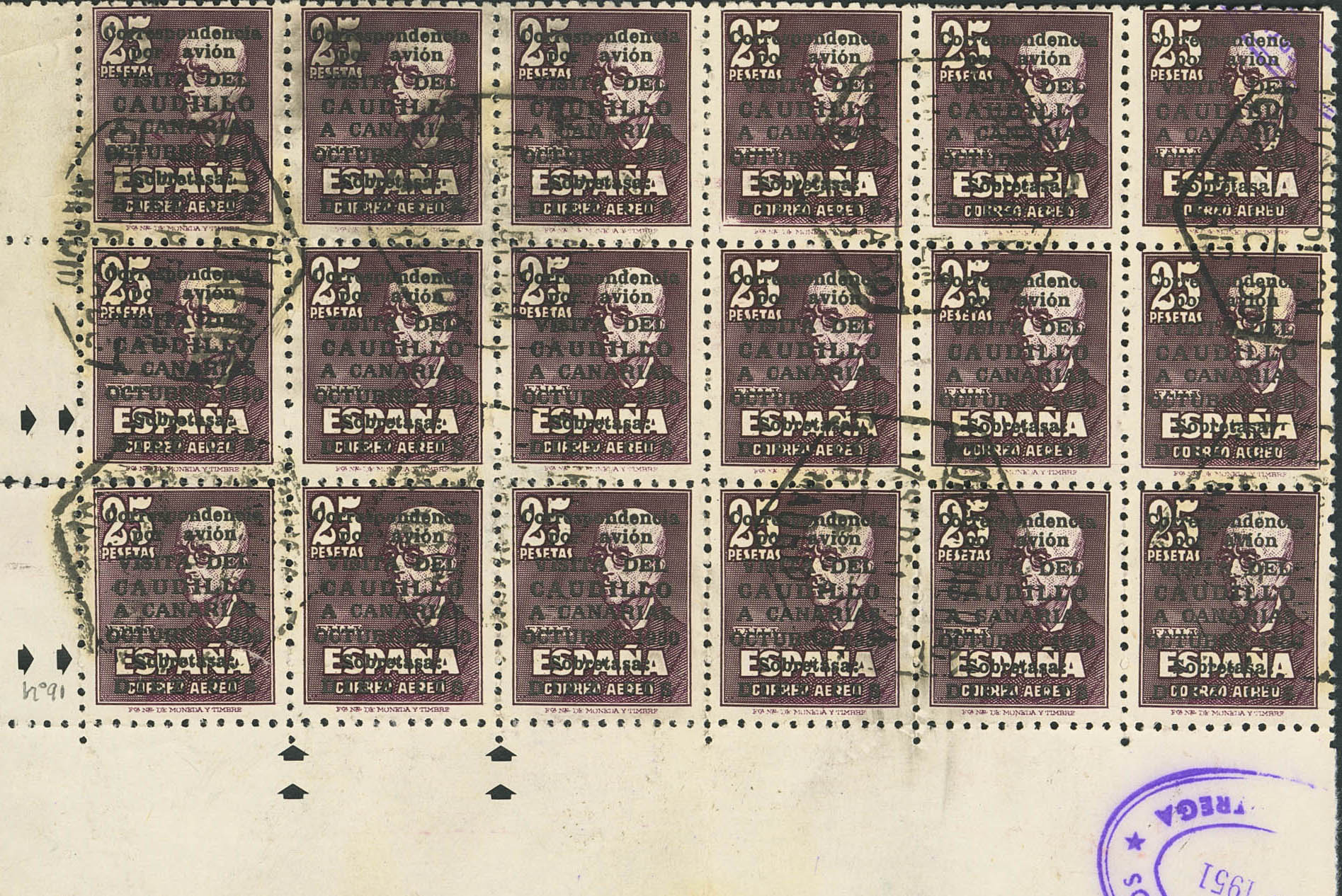 1090(18). 1951. 10 cts on 25 pts, block of eighteen, corner of sheet. CAUDILLO TO THE CANARY ISLANDS WITH NUMBER. AIR MAIL / CERTIFIED / MADRID postmark. MAGNIFICENT AND VERY RARE BLOCK, WITHOUT DOUBT THE LARGEST KNOWN IN USE. Edifil 2009: +++7,830 Euros