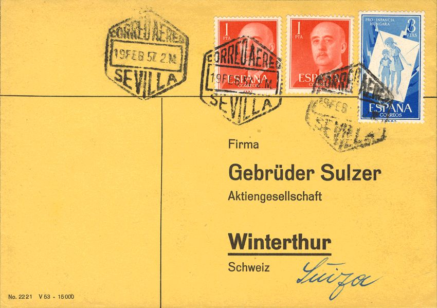 1205, 1153(2). 1957. 1 pts, two stamps and 3 pts. Air Charter from SEVILLE to WINTERTHUR (SWITZERLAND). MAGNIFICENT.