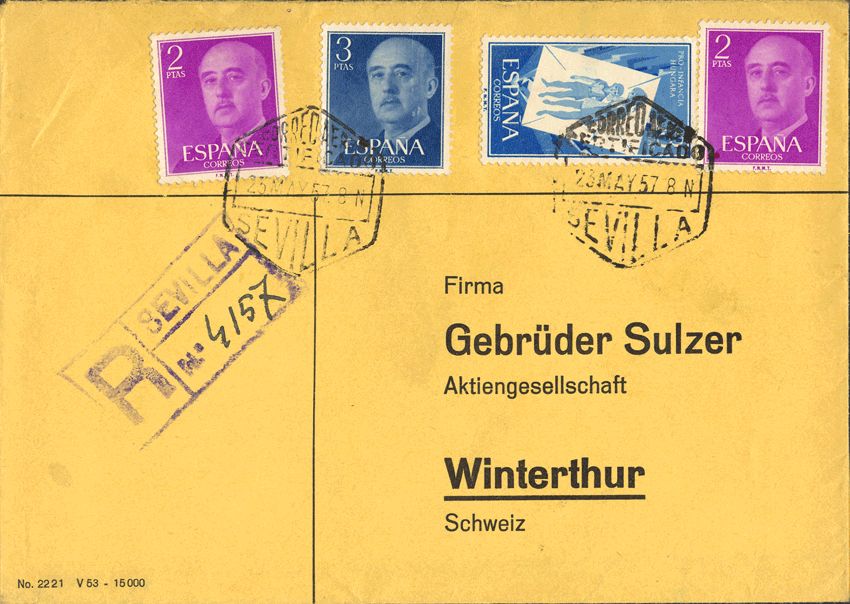 English 1205, 1158, 1159. 1957. 2 points, two stamps and 3 points, two stamps. Air Charter from SEVILLE to WINTERTHUR (SWITZERLAND). On the back arrival. MAGNIFICENT.