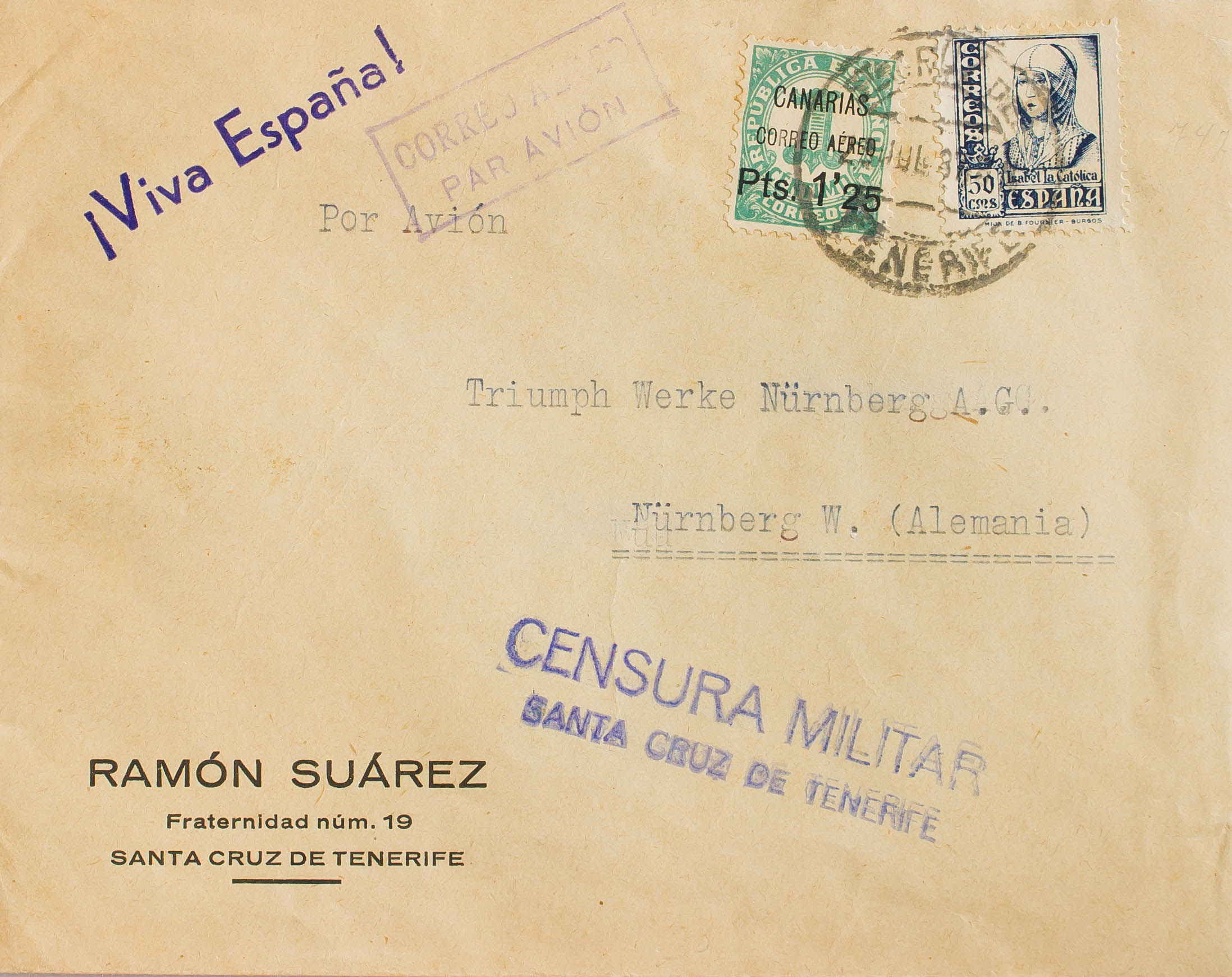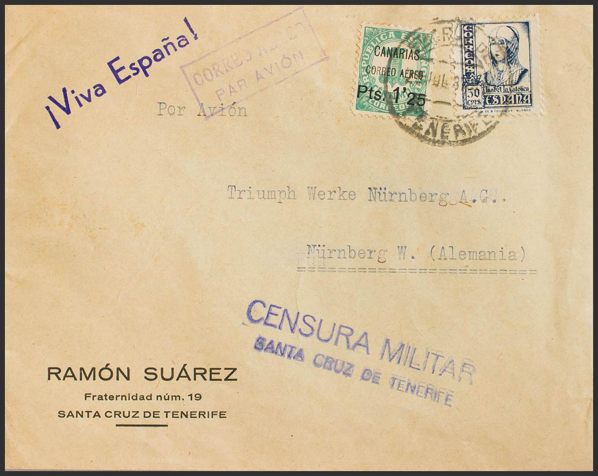 English 26. 1937. 1´25 on 1 cts and 50 cts blue. Airmail from SANTA CRUZ DE TENERIFE to NUREMBERG (GERMANY). MAGNIFICENT.