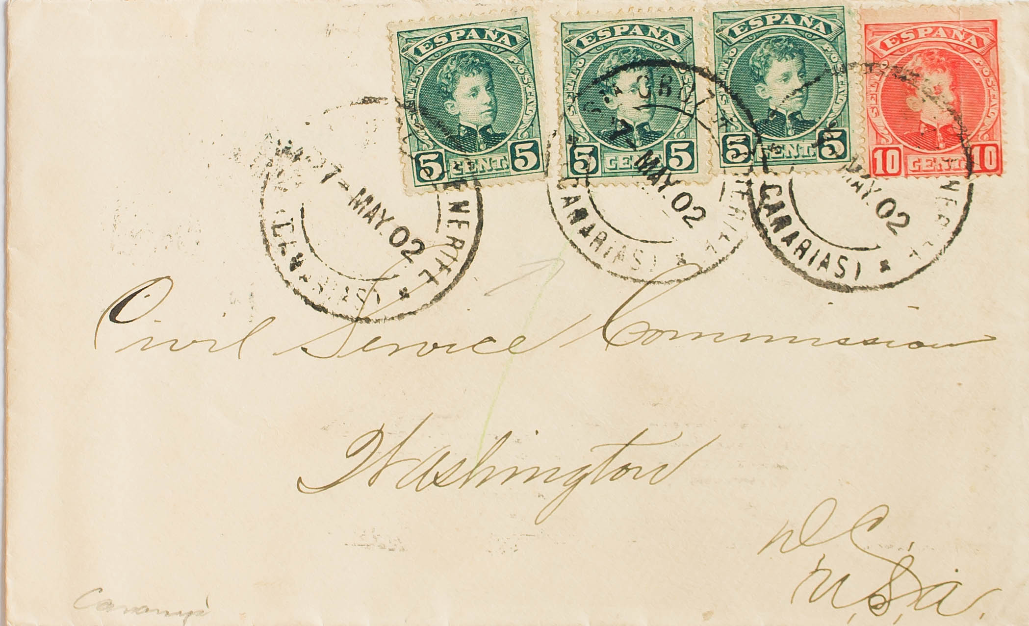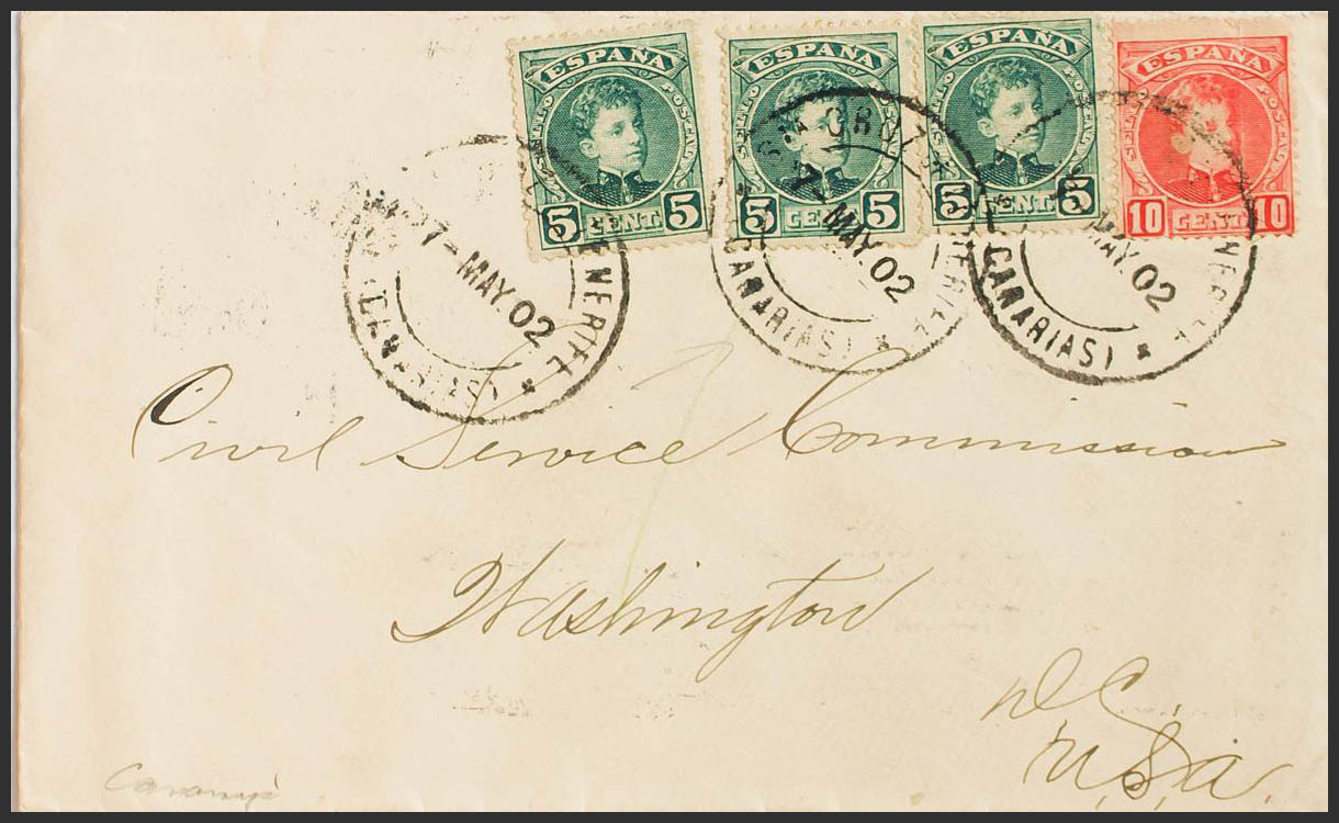 242(3), 243. 1902. 5 cts green, three stamps and 10 cts red. SANTA CRUZ DE TENERIFE to WASHINGTON (USA). On the back transits and arrival. MAGNIFICENT AND VERY BEAUTIFUL COMBINATION