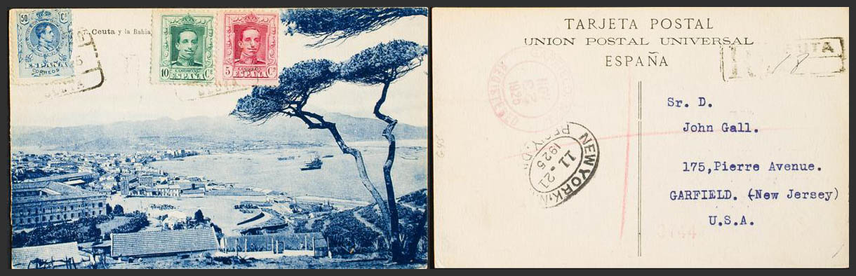 277, 312, 314. 1925. 50 cts blue, 5 cts carmine and 10 cts green. Certified Post Card from CEUTA to GARFIELD (USA). On the back arrival and certificate mark of Ceuta. MAGNIFICENT AND EXTRAORDINARILY RARE POSTAGE OF DIFFERENT ISSUES ON A CERTIFIED CARD WITH CEUTI ORIGIN.