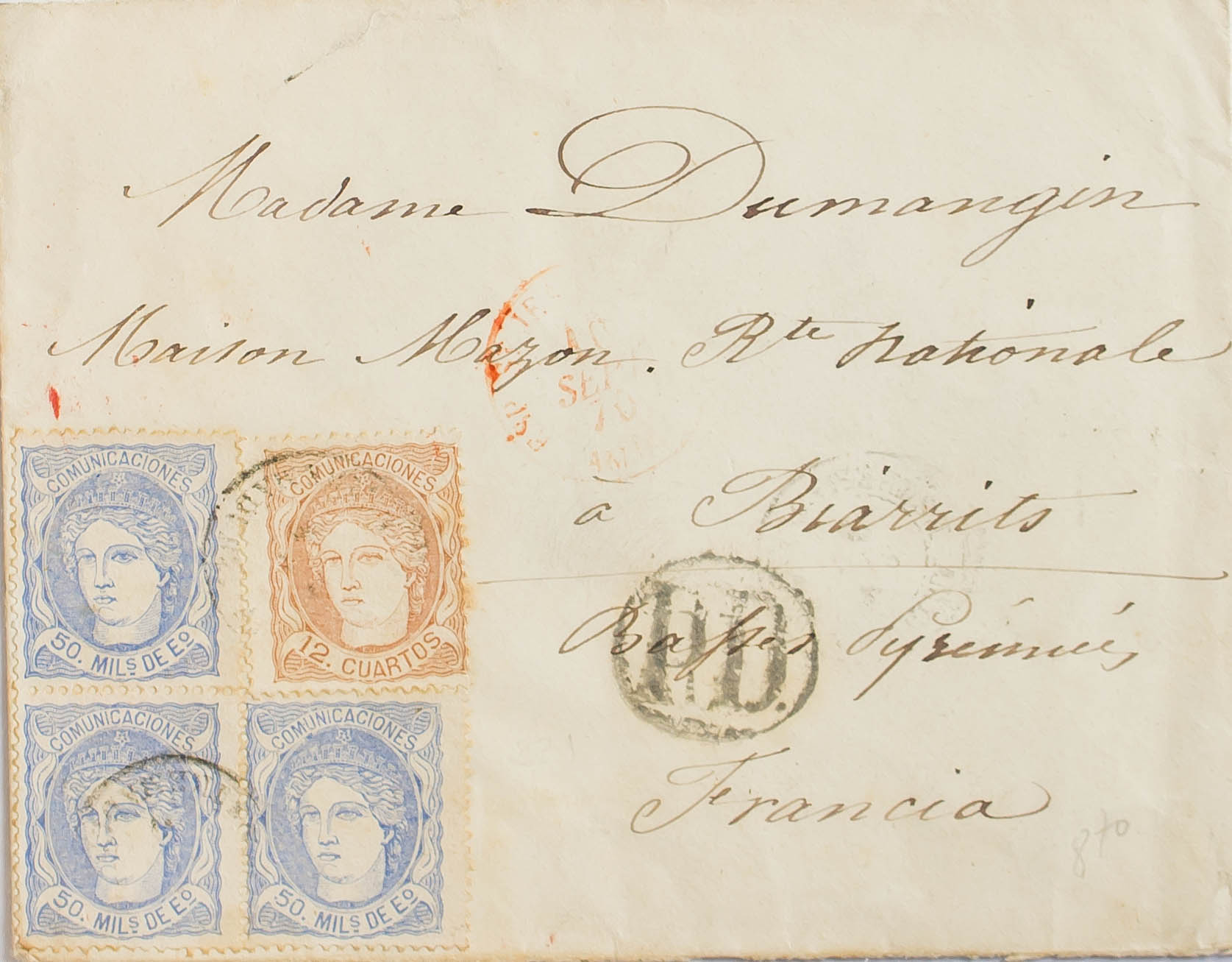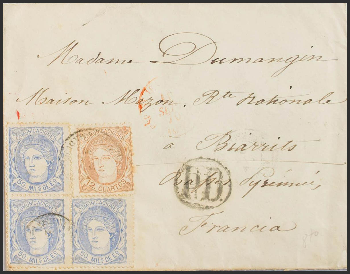 English 107(3), 113. 1870. 50 mils blue, block of three stamps and 12 cuartos chestnut. Addressed to BIARRITZ (FRANCE). MAGNIFICENT AND EXTRAORDINARILY RARE COMBINATION TO GET THE DOUBLE SHIPPING RATE.