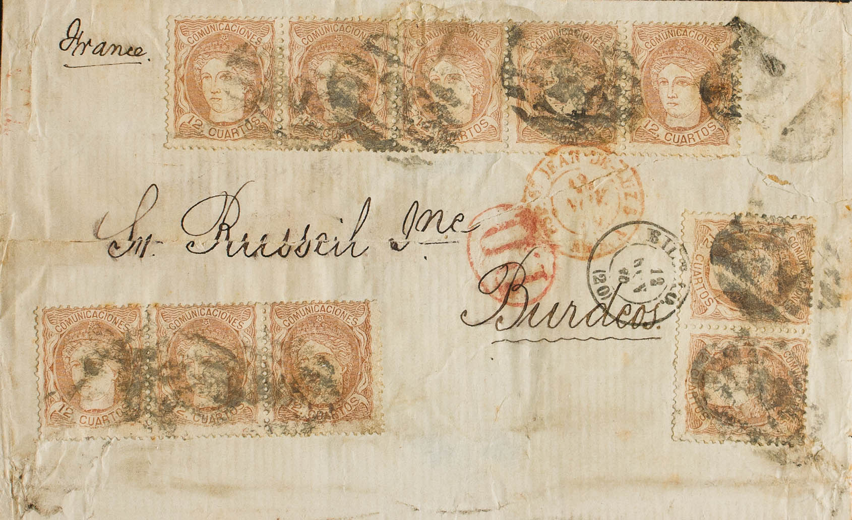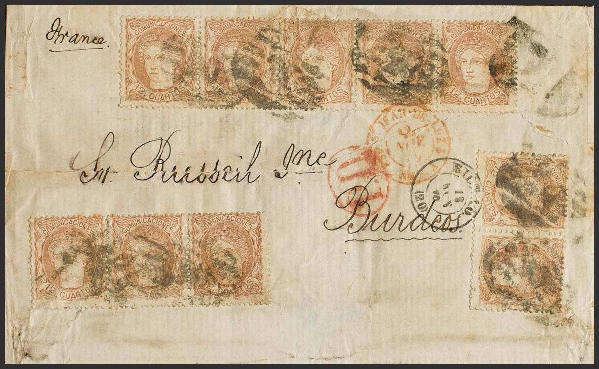 English 113(10). 1870. 12 chestnut cuartos , ten stamps. BILBAO to BORDEAUX (FRANCE). MAGNIFICENT AND SPECTACULAR POSTAGE OF TEN PORTES TO FRANCE, PROBABLY ONLY KNOWN. Certificate GRAUS.