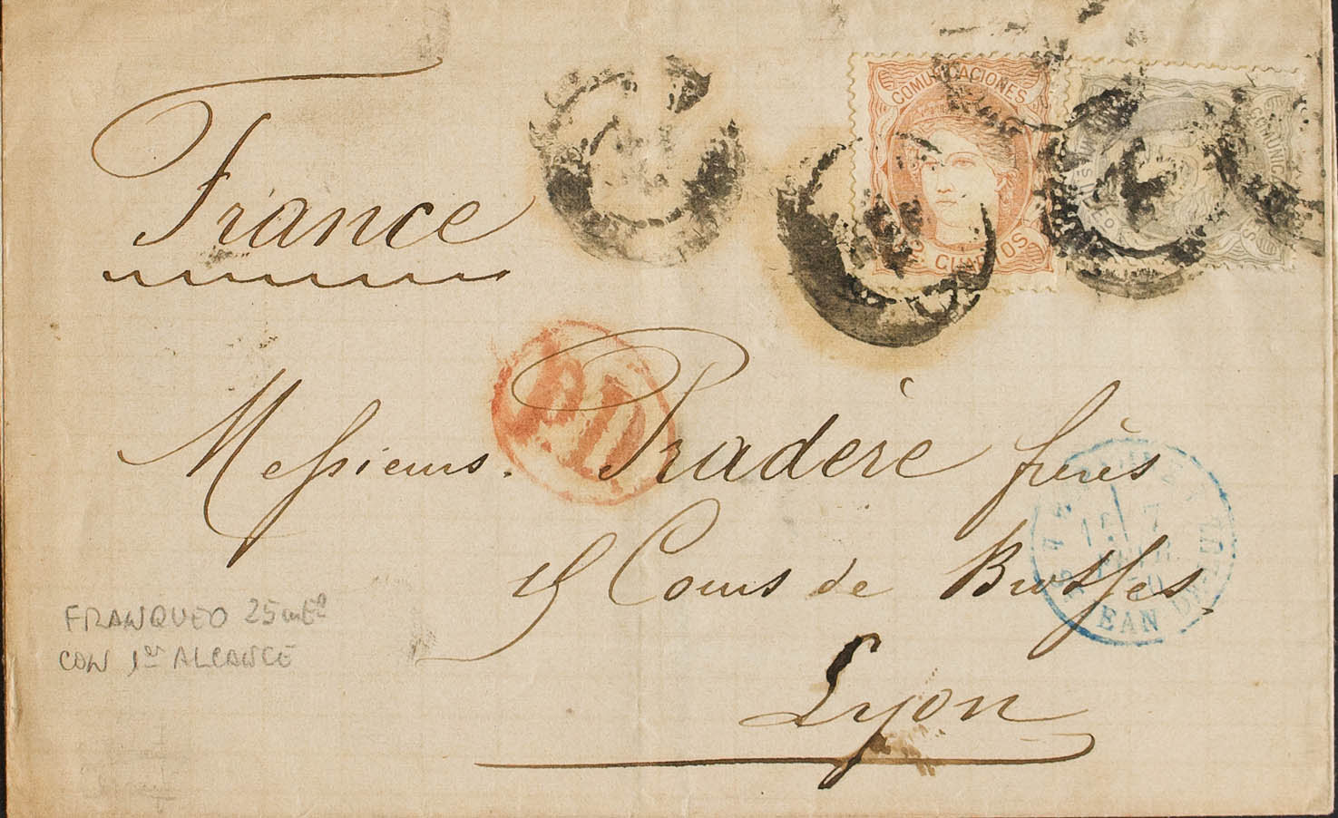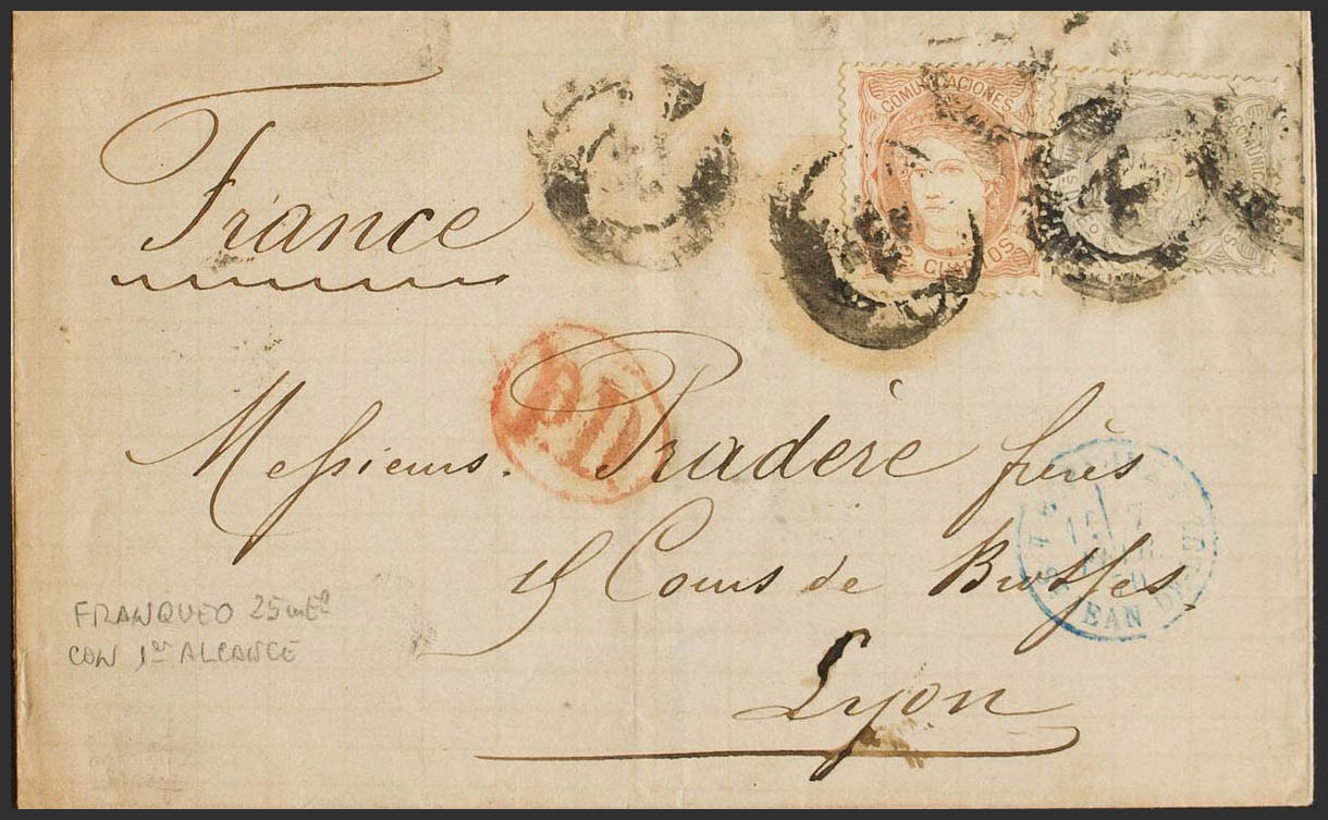 106, 113. 1870. 25 mils lilac gray and 12 cuartos chestnut. MADRID to LYON (FRANCE). MAGNIFICENT AND VERY RARE RANGE RATE, VERY RARE COMBINATION TO FRANCE.