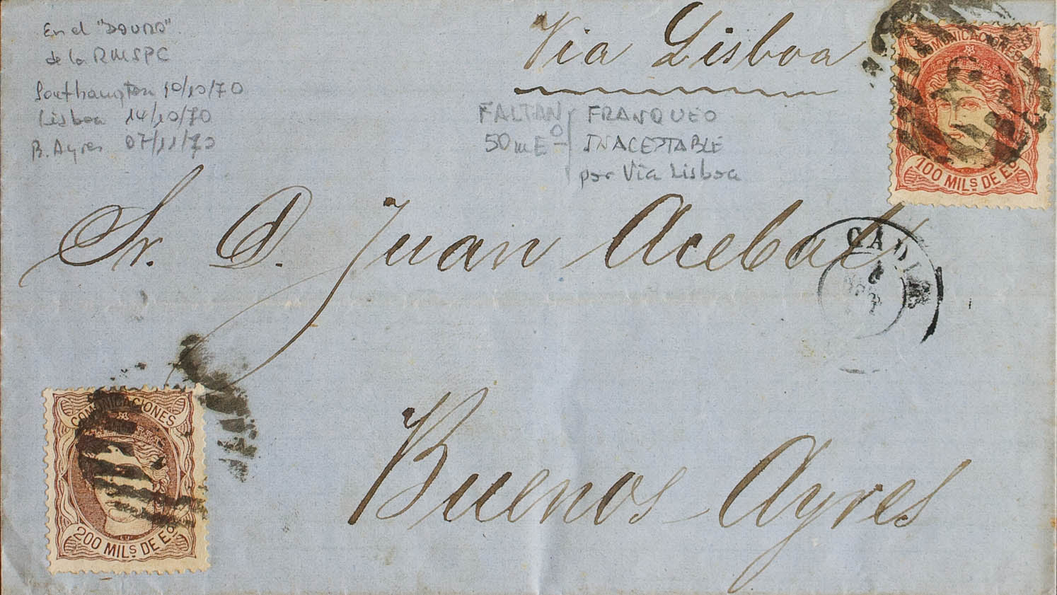 108, 109. 1870. 100 mils red chestnut and 200 mils chestnut. CADIZ to BUENOS AIRES (ARGENTINA). The correct postage for Argentina via Lisbon is 350 mils according to the rate of August 1867. MAGNIFICENT AND RARE INSUFFICIENT AND UNASSESSED POSTAGE.