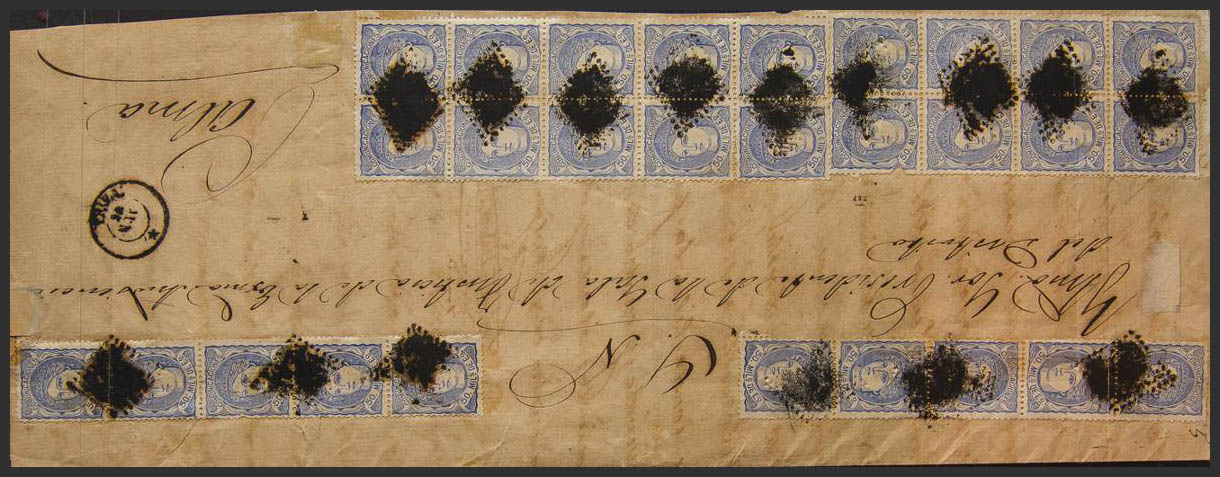 English 107(28). 1870. 50 mils overseas, twenty-eight stamps. Judicial Escrow from INCA to PALMA. MAGNIFICENT AND SPECTACULAR POSTAGE.
