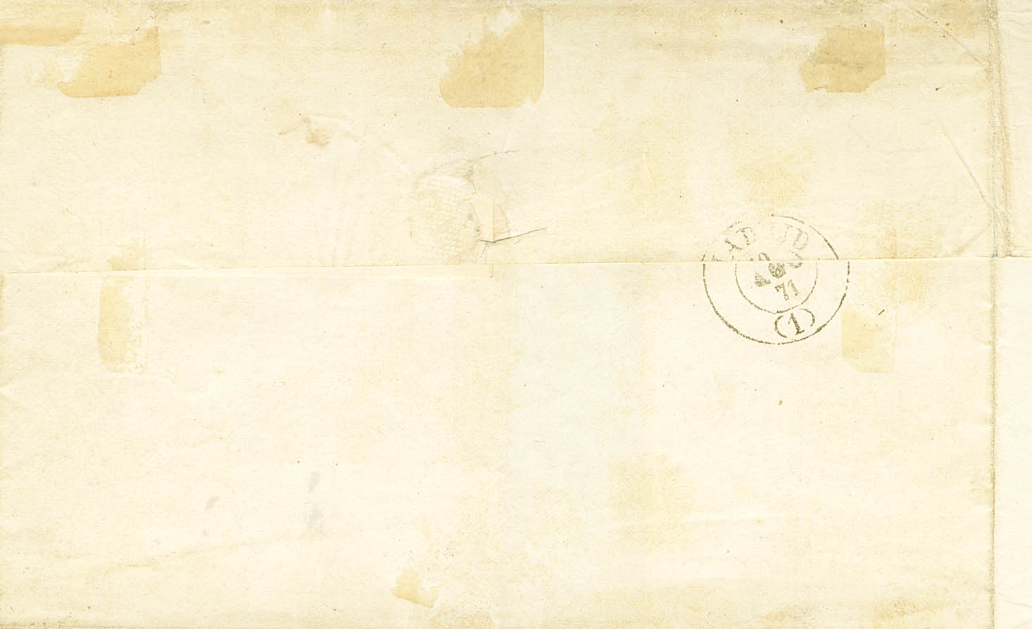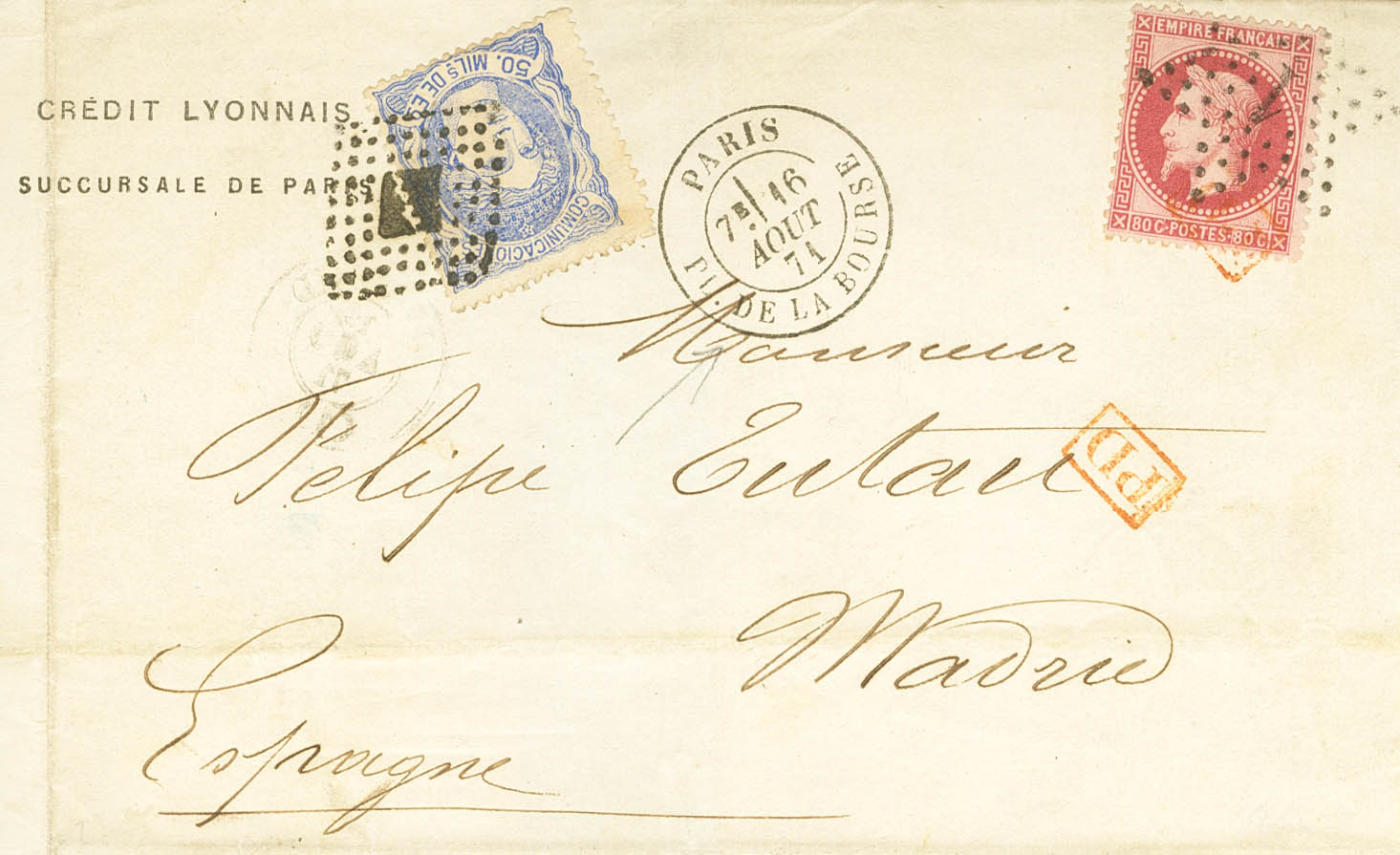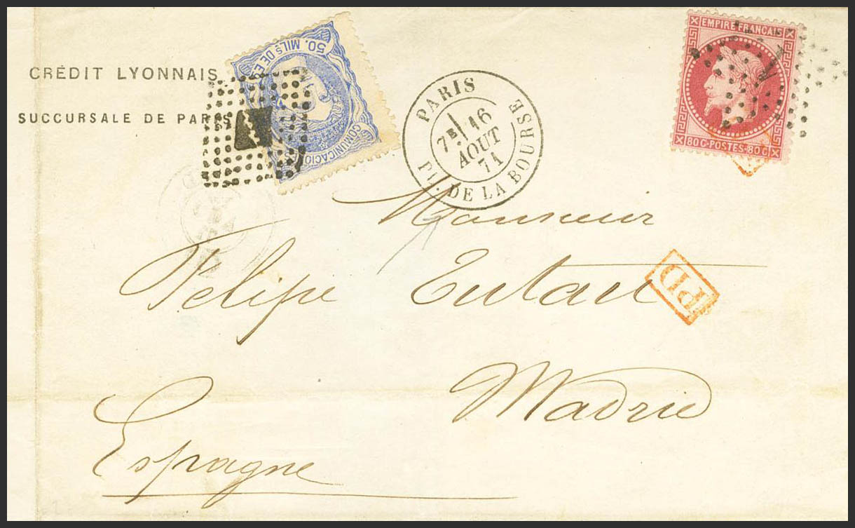 107, France Yv 32. 1871. 50 mils blue and 80 cts carmine, French stamp. PARIS to MADRID. RHOMBUS OF POINTS postmark on the Spanish stamp, the French stamp postmark STAR Nº1, from Paris. MAGNIFICENT AND VERY RARE MIXED POSTAGE. Cert. GRAUS. (although the piece has a certificate, it raises certain doubts, especially the 50 mils stamp, the piece also retains a Fulpius certificate and has the auction card from the 1950s from the Jouvenet collection, sold without guarantee).