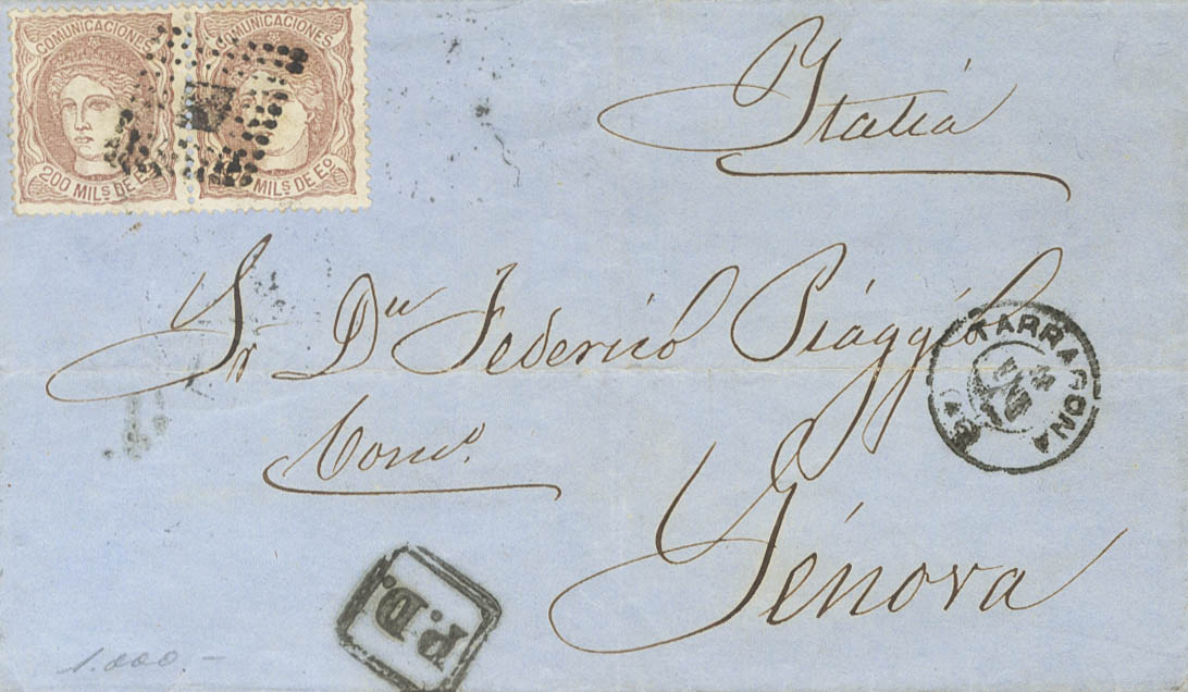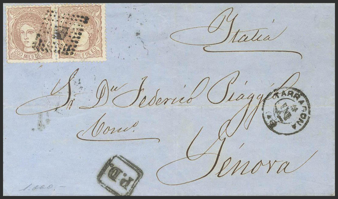 109(2). 1872. 200 mils chestnut, pair. TARRAGONA to GENOA (ITALY). POINT RHOMBUS postmark. MAGNIFICENT AND RARE DOUBLE POSTAGE POSTAGE TO ITALY.