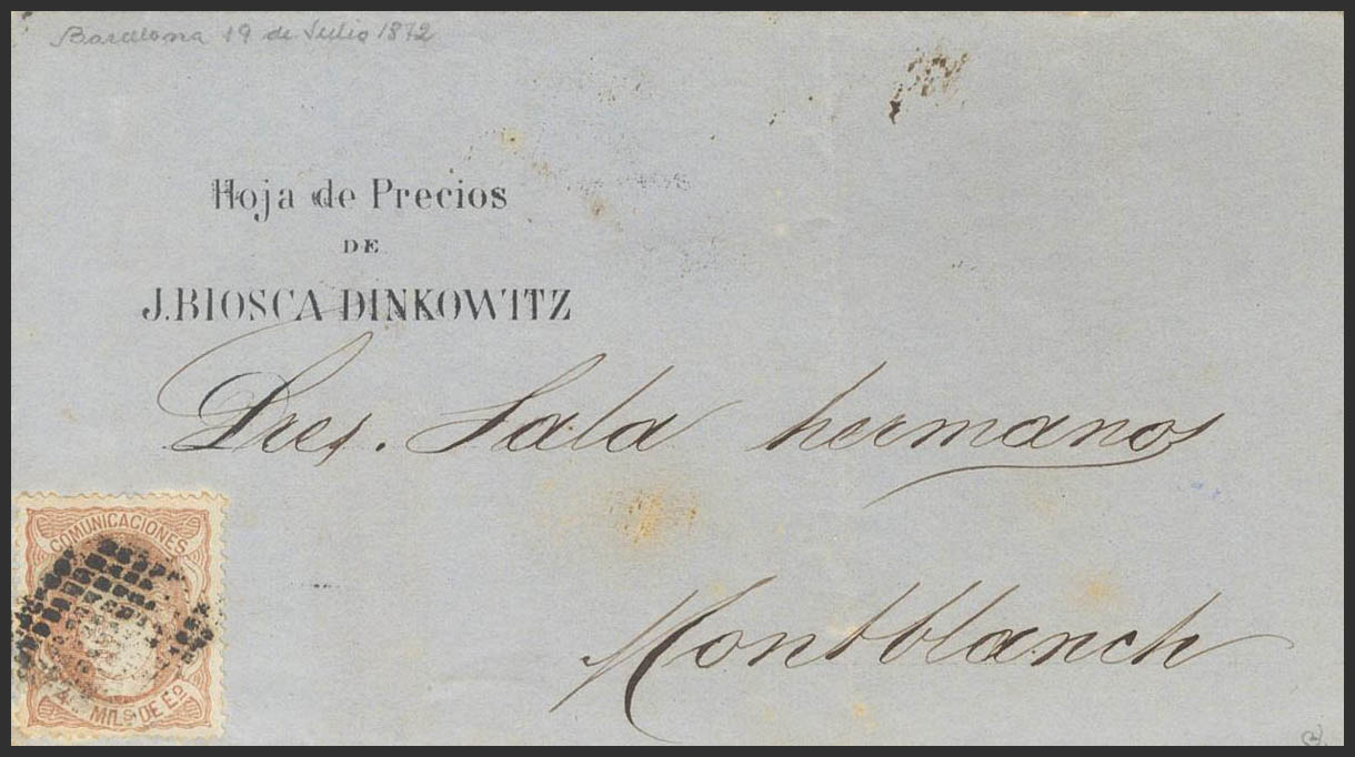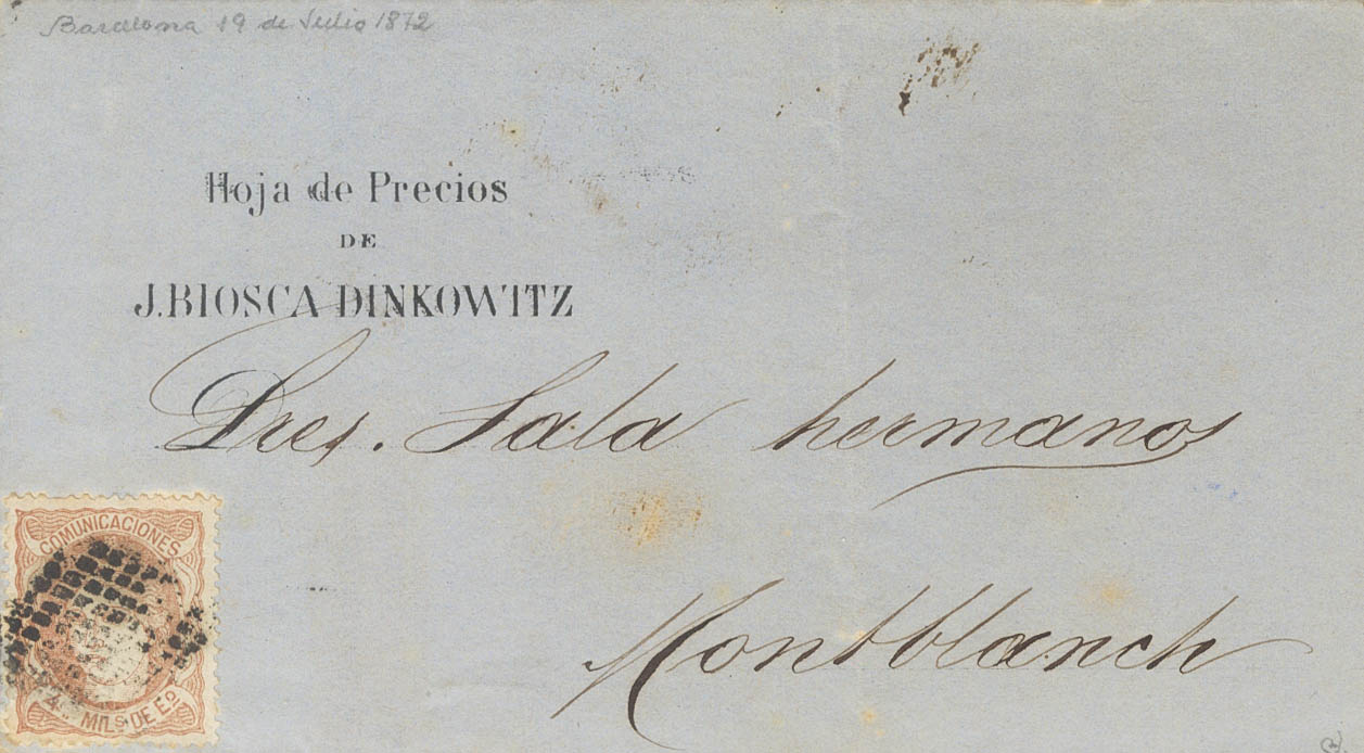 104. 1872. 4 mils sepia. BARCELONA to MONTBLANCH (TARRAGONA). Postage for four printed shipments (1 mils for every 5 grams). MAGNIFICENT AND RARE.