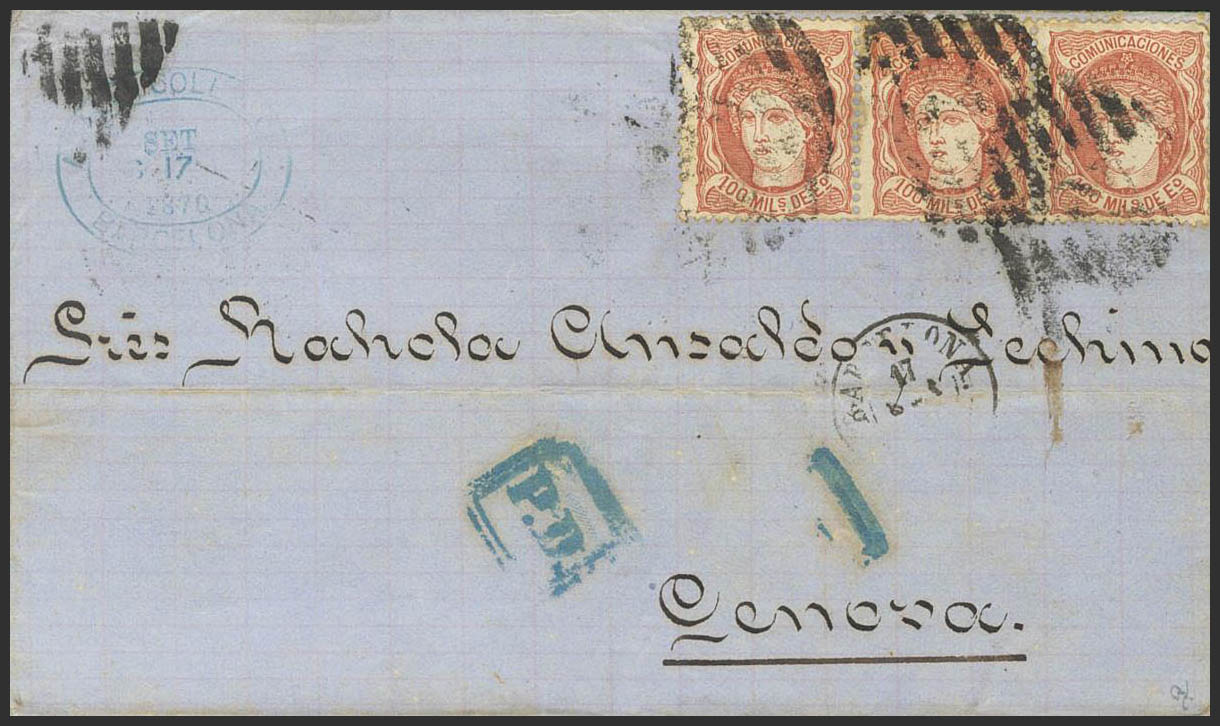 108(3). 1870. 100 mils chestnut red, three stamps. BARCELONA to GENOA. Circulated with excess postage of 100 mils. MAGNIFICENT AND RARE.