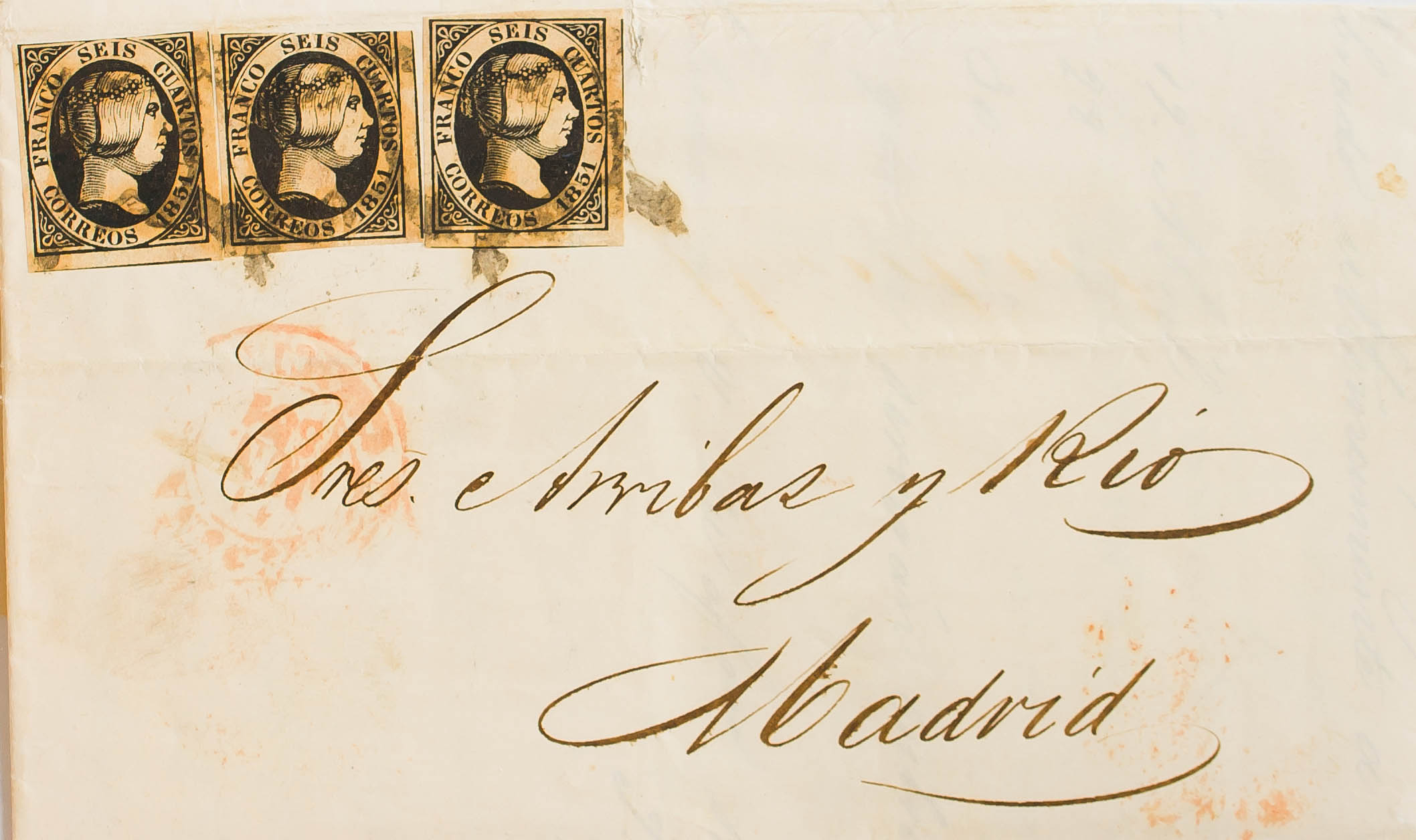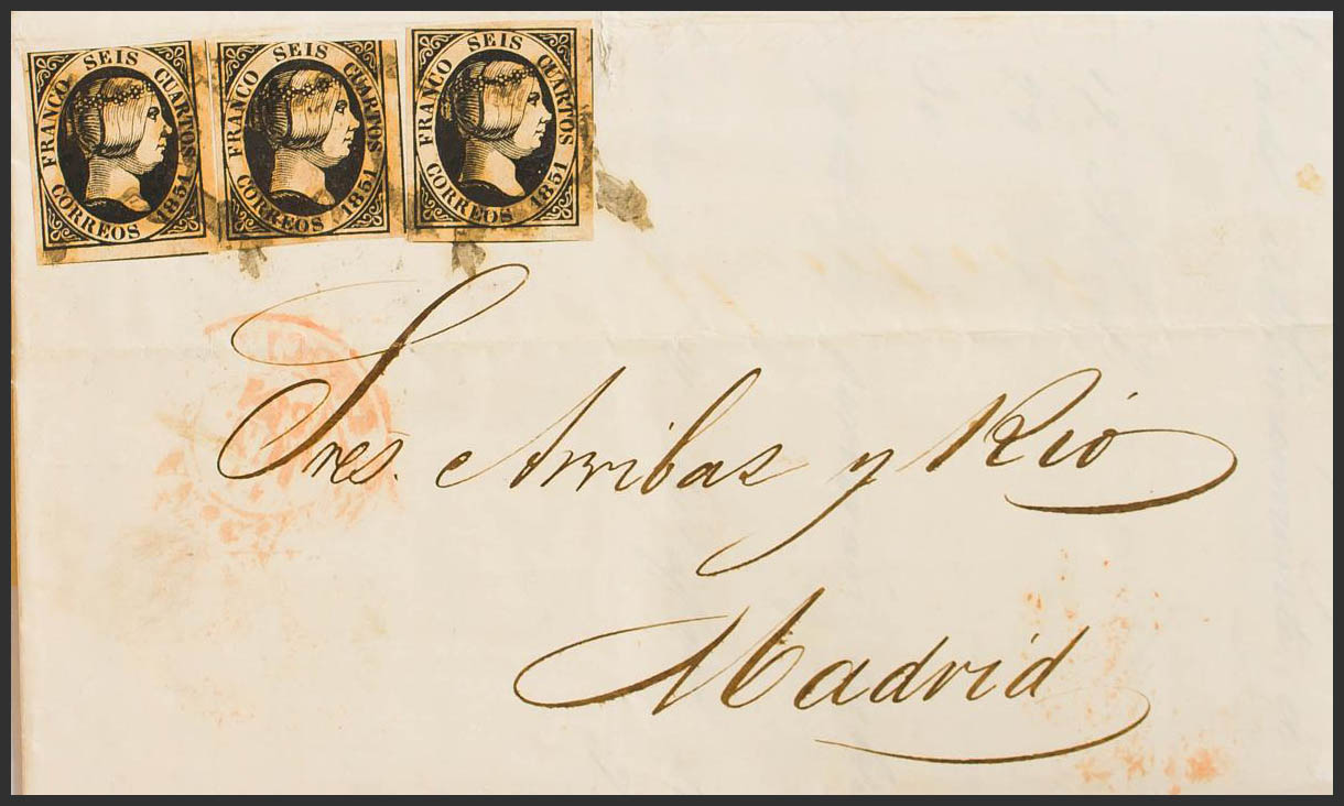 English 6(3). 1851. 6 black cuartos , three stamps. CORUÑA to MADRID. MAGNIFICENT AND VERY RARE WITH TRIPLE PORTION.